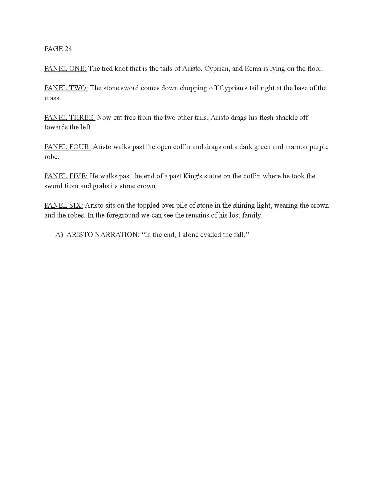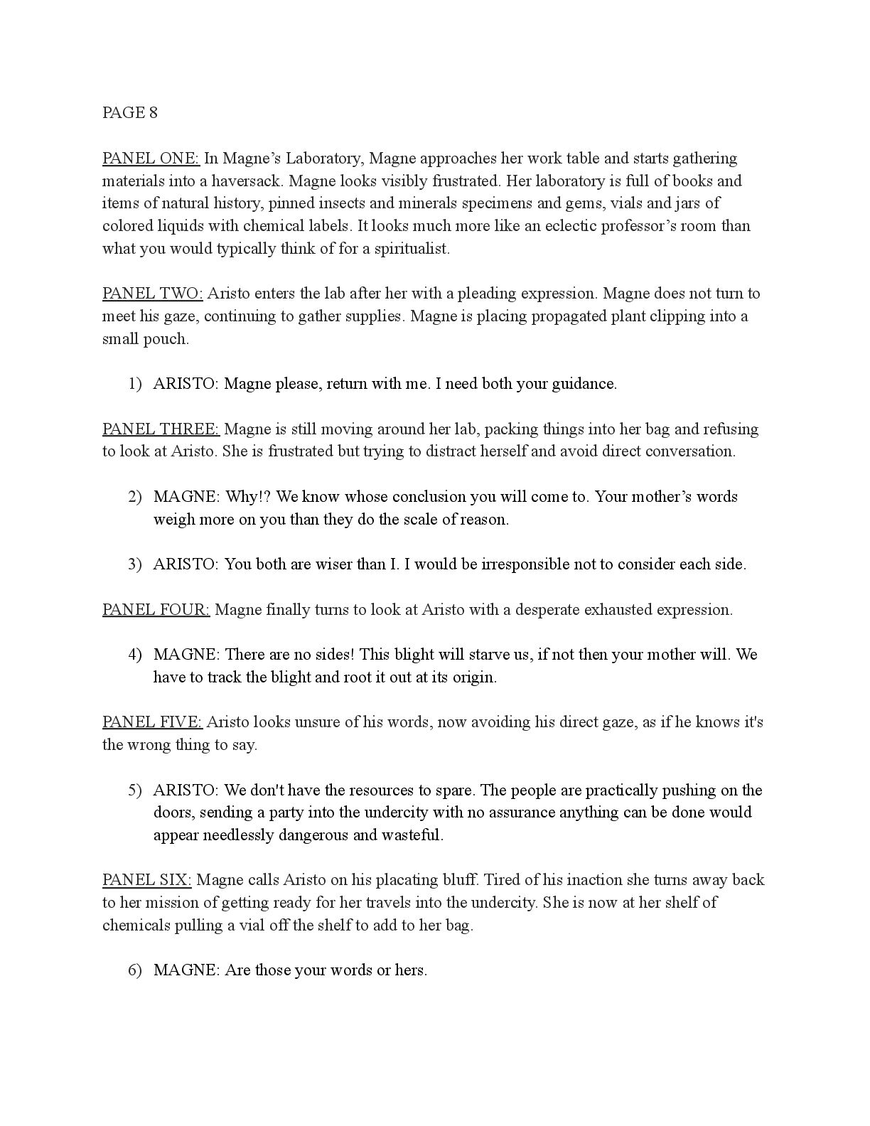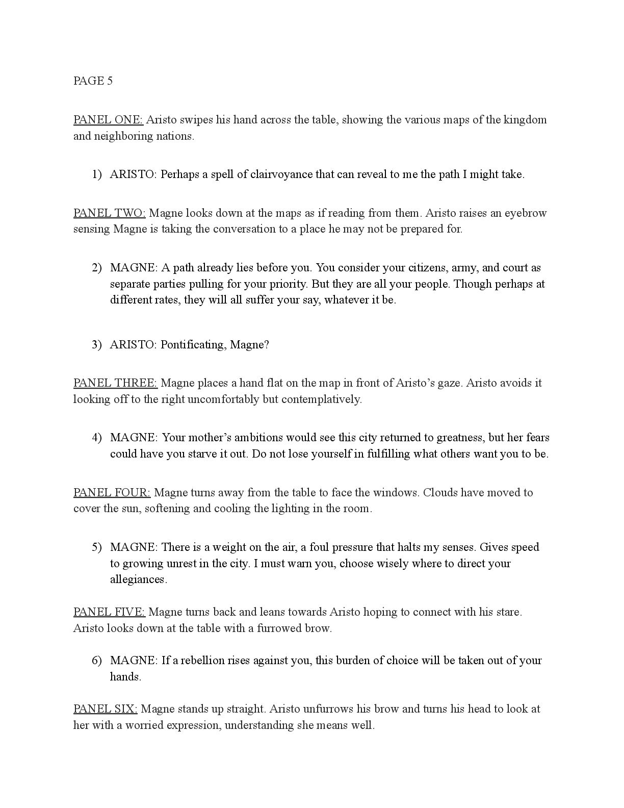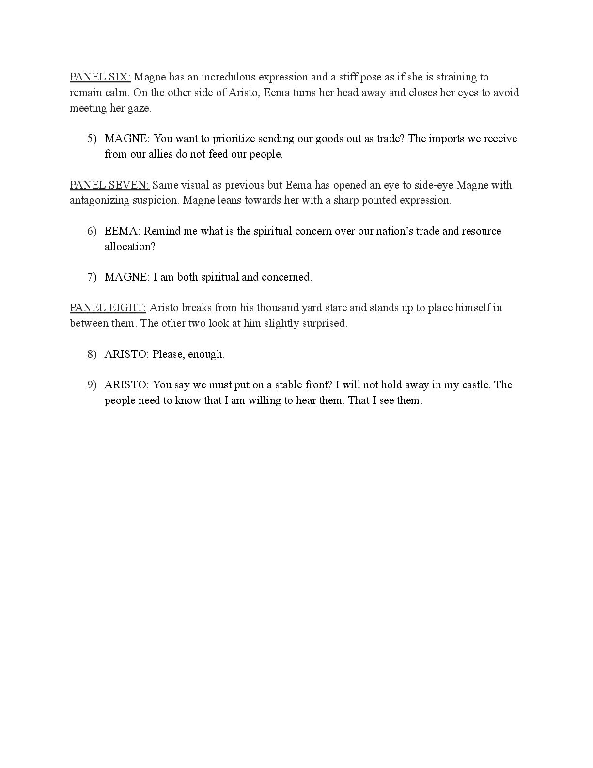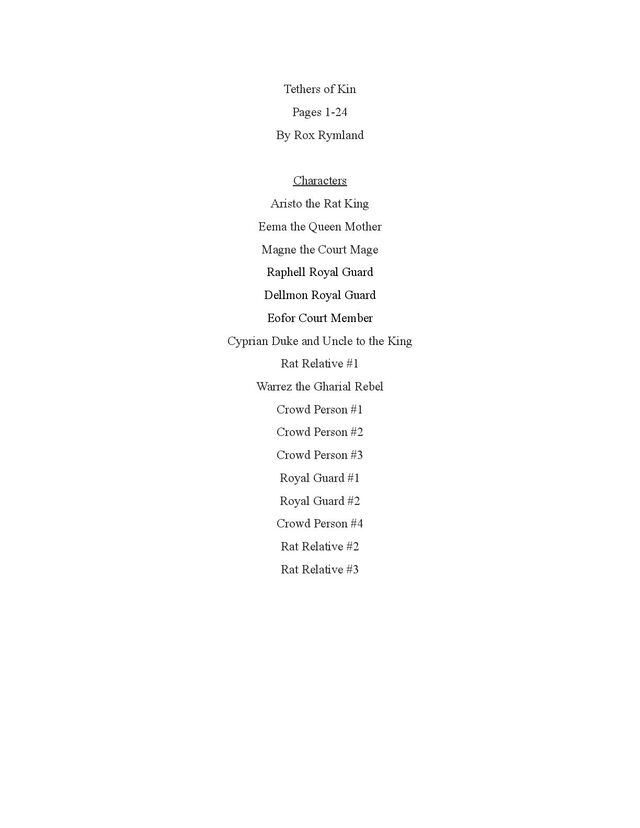 a torch was lit we see Aristo walking up to his mother in a castle corridor. His stature is meek and he looks defeated from his argument with Magne. His mothers arms are outstretched towards him. PANEL TWO: Aristo slinks into his mothers arm, looking uncomfortable as his mother is not normally affectionate. He lets her hug him but does not hug back. His expression looks as if he is miles away in thought. Eema consoles him. PANEL THREE: Closer shot on Eema whispering into Aristo's ears, she has a sinister expression with a malicious grin bringing the corners of her mouth close to her ears. Eema is telling him how to move forward. This is the start of the kingdom's fall into oligarchy. PANEL FOUR: The next morning, guard is doubled in the square. Eofor is standing on a podium. Cyprian and another rat family member stands behind him. Above him a sign has been raised which tells of the implemented food rationing. A) BANNER TEXT: Food rationing effective immediately. Wheat, Rye, Oats and Barley: 2 marks per person per day 6 mark limit on families of 4 or more B) BANNER TEXT: CAUTION CONTAMINATION turn over all produce, poultry, dairy, and meat. PANEL FIVE: More protesters are in the square than ever. Warrez is at the front of the crowd now, instigating a fight between the citizens and the guards. The podium is toppled over and Eofor and the rat relative are looking discombobulated and scared. Cyprian is shoving a citizen away. PANEL SIX: Outside the gates of the city walls, a carriage pulled by giant bug-like beasts is being loaded up with crops and bags of grains. Guards stand on either side of the gates, forcing back angry citizens upset that food is being exported while they are forced to ration. PANEL SEVEN: Back at the castle, the guards are shown eating without rationing, drinking ale and laughing amongst themselves. PANEL EIGHT: In the castle dining room, the royal court sits around the grand table with a kingly spread of meats and fruits, other produce and wine. They are all laughing and eating to their heart's content. Aristo is sat at the head of the table dead still. His plate is empty. His mother is to his right with a full plate. She is placing a cut of meat onto Aristo’s plate.