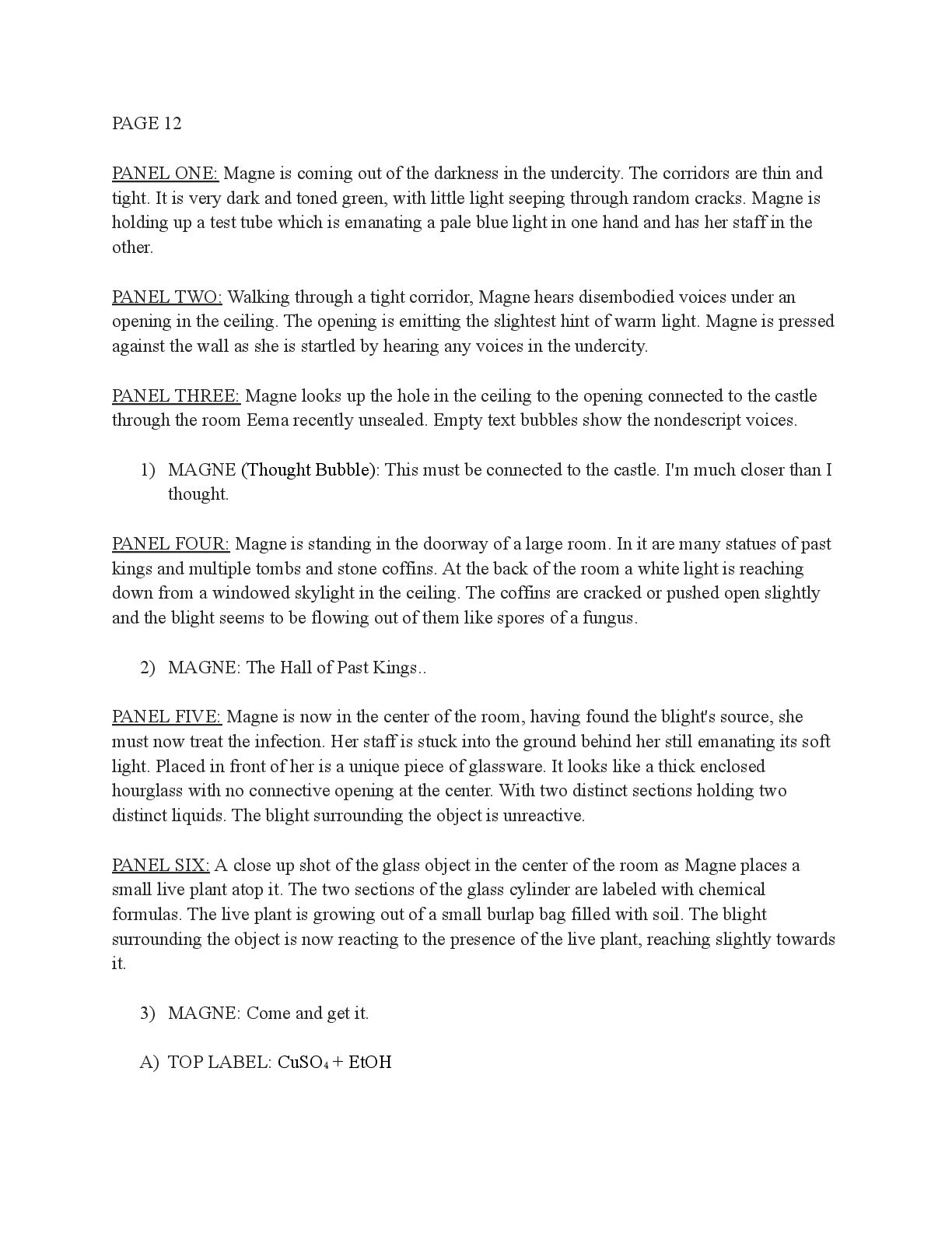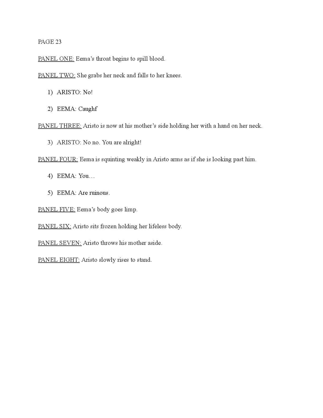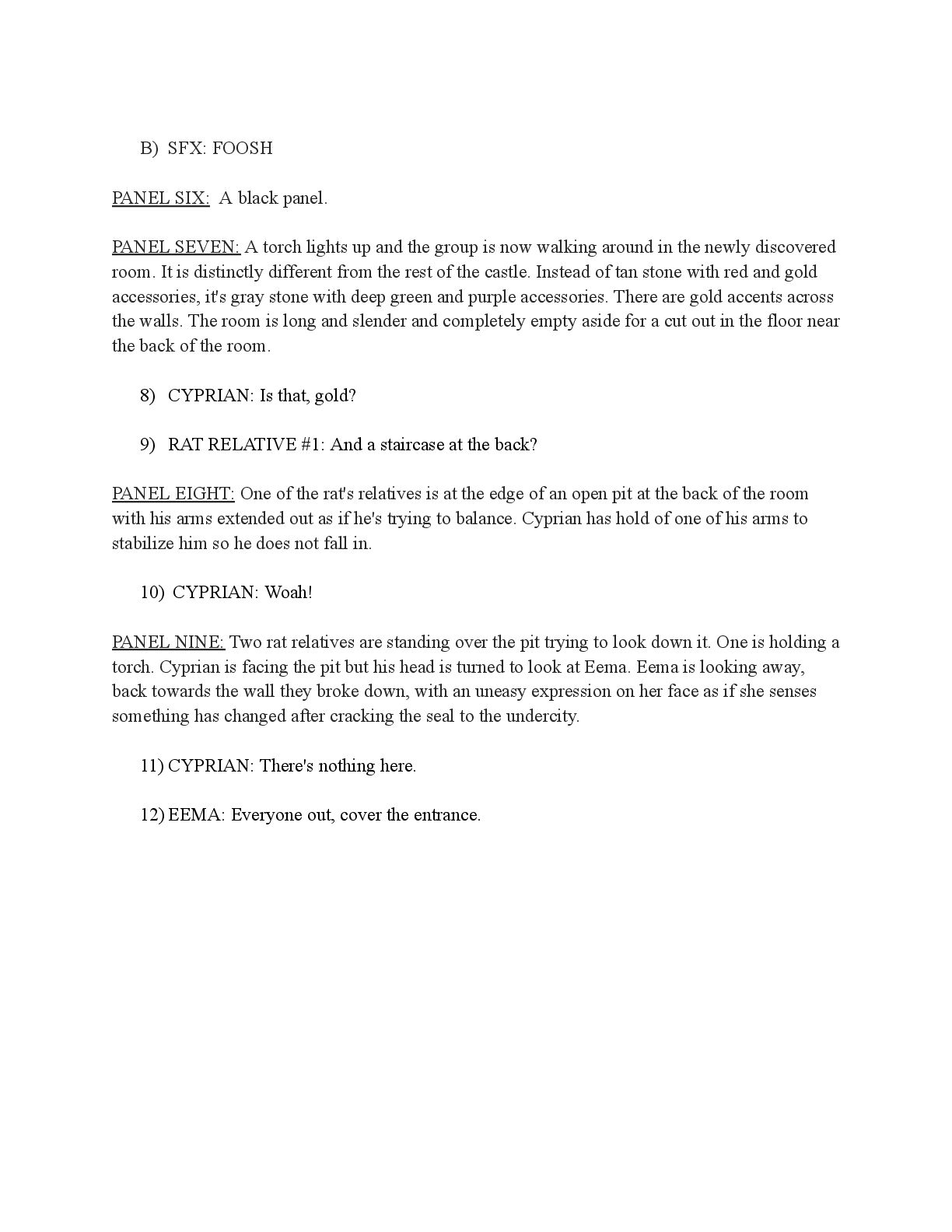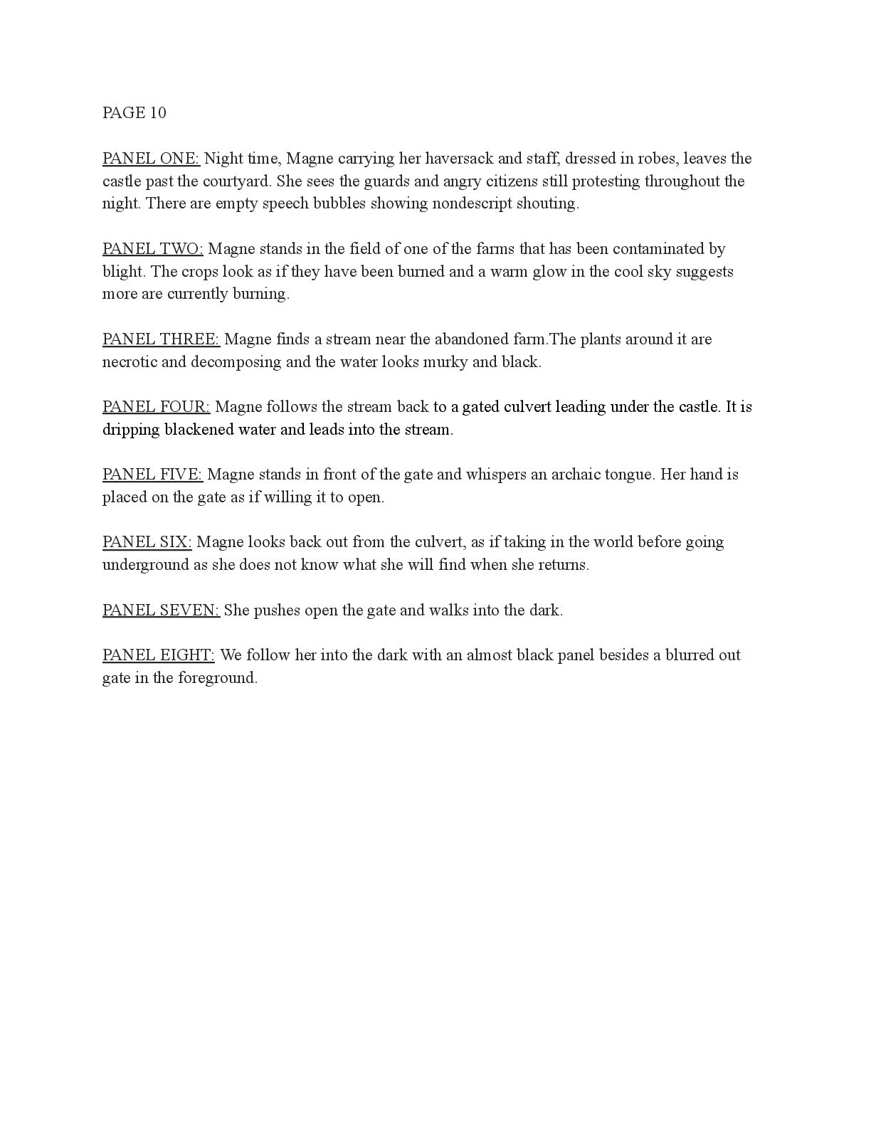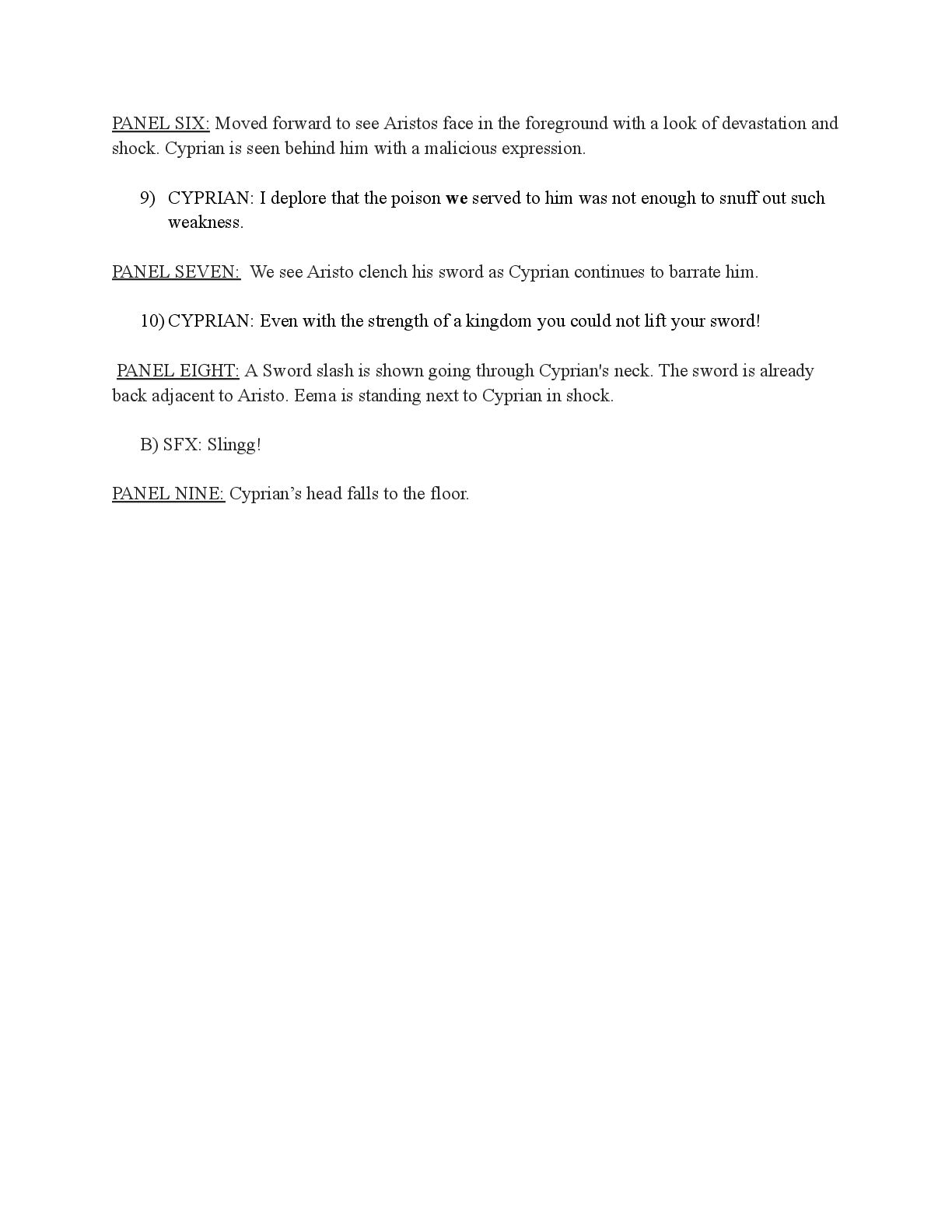 a torch was lit we see Aristo walking up to his mother in a castle corridor. His stature is meek and he looks defeated from his argument with Magne. His mothers arms are outstretched towards him. PANEL TWO: Aristo slinks into his mothers arm, looking uncomfortable as his mother is not normally affectionate. He lets her hug him but does not hug back. His expression looks as if he is miles away in thought. Eema consoles him. PANEL THREE: Closer shot on Eema whispering into Aristo's ears, she has a sinister expression with a malicious grin bringing the corners of her mouth close to her ears. Eema is telling him how to move forward. This is the start of the kingdom's fall into oligarchy. PANEL FOUR: The next morning, guard is doubled in the square. Eofor is standing on a podium. Cyprian and another rat family member stands behind him. Above him a sign has been raised which tells of the implemented food rationing. A) BANNER TEXT: Food rationing effective immediately. Wheat, Rye, Oats and Barley: 2 marks per person per day 6 mark limit on families of 4 or more B) BANNER TEXT: CAUTION CONTAMINATION turn over all produce, poultry, dairy, and meat. PANEL FIVE: More protesters are in the square than ever. Warrez is at the front of the crowd now, instigating a fight between the citizens and the guards. The podium is toppled over and Eofor and the rat relative are looking discombobulated and scared. Cyprian is shoving a citizen away. PANEL SIX: Outside the gates of the city walls, a carriage pulled by giant bug-like beasts is being loaded up with crops and bags of grains. Guards stand on either side of the gates, forcing back angry citizens upset that food is being exported while they are forced to ration. PANEL SEVEN: Back at the castle, the guards are shown eating without rationing, drinking ale and laughing amongst themselves. PANEL EIGHT: In the castle dining room, the royal court sits around the grand table with a kingly spread of meats and fruits, other produce and wine. They are all laughing and eating to their heart's content. Aristo is sat at the head of the table dead still. His plate is empty. His mother is to his right with a full plate. She is placing a cut of meat onto Aristo’s plate.