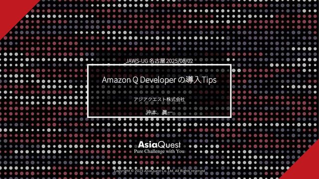 Challenge with You Copyright © 2025 AsiaQuest Co.,Ltd. All Rights reserved JAWS-UG 名古屋 2025/08/02 Amazon Q Developer の導入Tips アジアクエスト株式会社 沖本 眞一