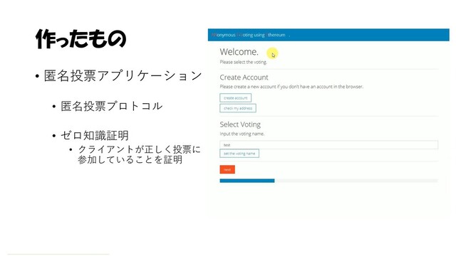 𝑔𝑥𝑖𝑦𝑖 ς 𝑔𝑣𝑖 • ς 𝑔𝑥𝑖𝑦𝑖 = 𝑔σ 𝑥𝑖𝑦𝑖 = 𝑔0 (∵ σ 𝑥𝑖 ( 𝑥1 + ⋯ + 𝑥𝑖−1 − (𝑥𝑖+1 + ⋯ + 𝑥𝑛 )) = 1) • ς 𝑔𝑣𝑖 = 𝑔σ 𝑣𝑖 • ς 𝑏𝑖 = 1 × 𝑔σ 𝑣𝑖 匿名投票プロトコル 秘密鍵 𝑥 ∈ {1, 2, … , 𝑝 − 1} 公開鍵 𝑔𝑥 𝑚𝑜𝑑 𝑝 魔法鍵 𝑔𝑦𝑖 = 𝑔 𝑥1+⋯+𝑥𝑖−1 −(𝑥𝑖+1+⋯+𝑥𝑛) 投票 𝑏𝑖 = 𝑔𝑥𝑖𝑦𝑖𝑔𝑣𝑖 (𝑣𝑖 ∈ {0, 1}) log を取れば yes の個数になる リンク: http://163.44.149.64/ A (3, 8) 60−12 = 6−12 6−3661 B (2, 10) 63−10 = 6−7 6−1461 C (10, 4) 65 65060 (sec, pub) magic ballot Yes Yes No 62