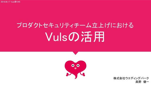プロダクトセキュリティチーム立上げにおける Vulsの活用 株式会社ウエディングパーク 奥野 健一 2019.06.17 Vuls祭り#5