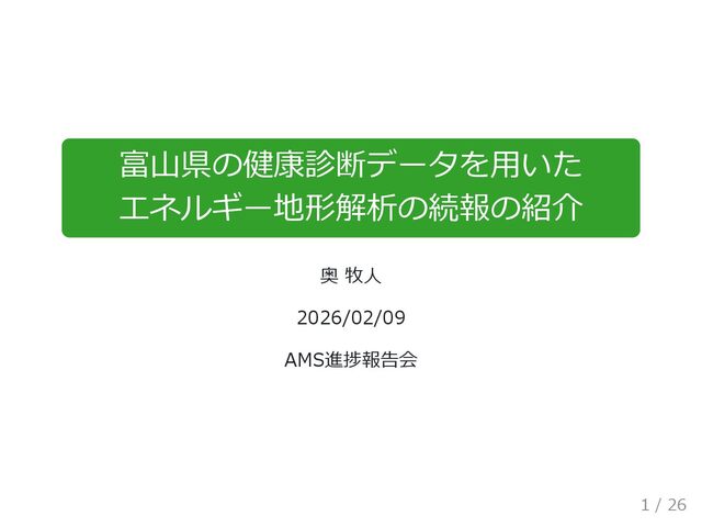 富山県の健康診断データを用いた エネルギー地形解析の続報の紹介 奥 牧人 2026/02/09 AMS進捗報告会 1 / 26