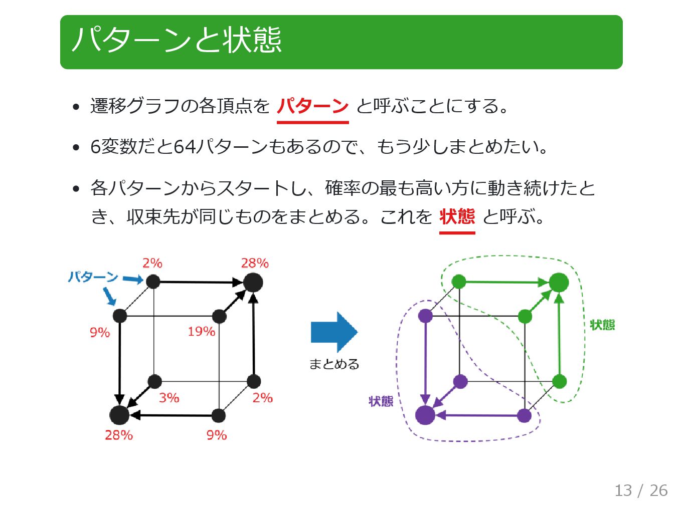 パターンと状態 遷移グラフの各頂点を パターン と呼ぶことにする。 6変数だと64パターンもあるので、もう少しまとめたい。 各パターンからスタートし、確率の最も高い方に動き続けたと き、収束先が同じものをまとめる。これを 状態 と呼ぶ。 13