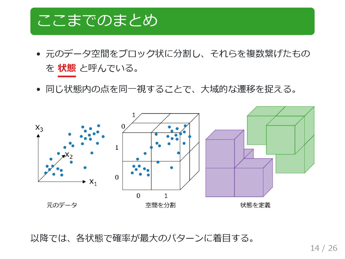 ここまでのまとめ 元のデータ空間をブロック状に分割し、それらを複数繋げたもの を 状態 と呼んでいる。 同じ状態内の点を同一視することで、大域的な遷移を捉える。 以降では、各状態で確率が最大のパターンに着目する。 14 / 26