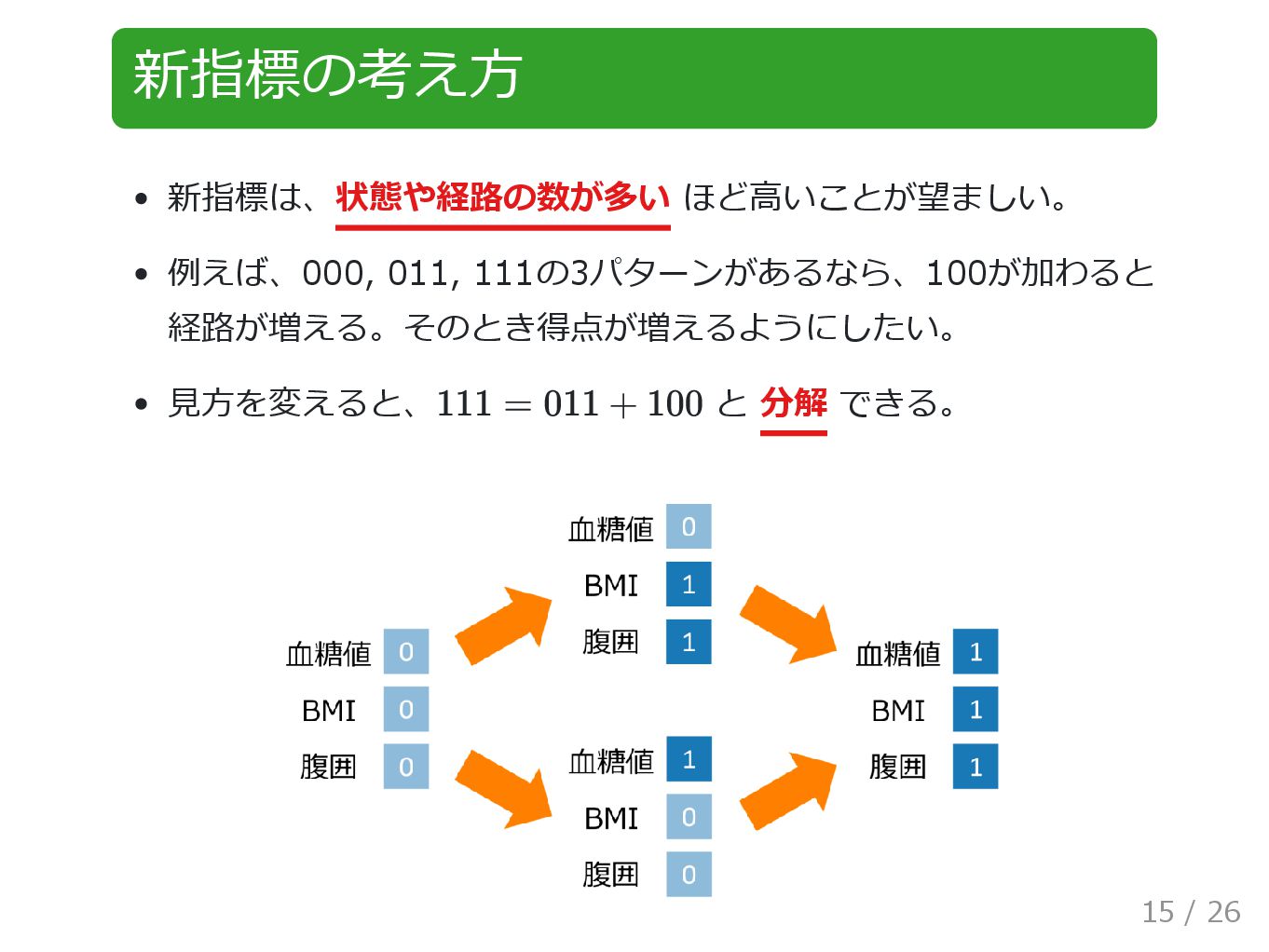 新指標の考え方 新指標は、状態や経路の数が多い ほど高いことが望ましい。 例えば、000, 011, 111の3パターンがあるなら、100が加わると 経路が増える。そのとき得点が増えるようにしたい。 見方を変えると、 と 分解