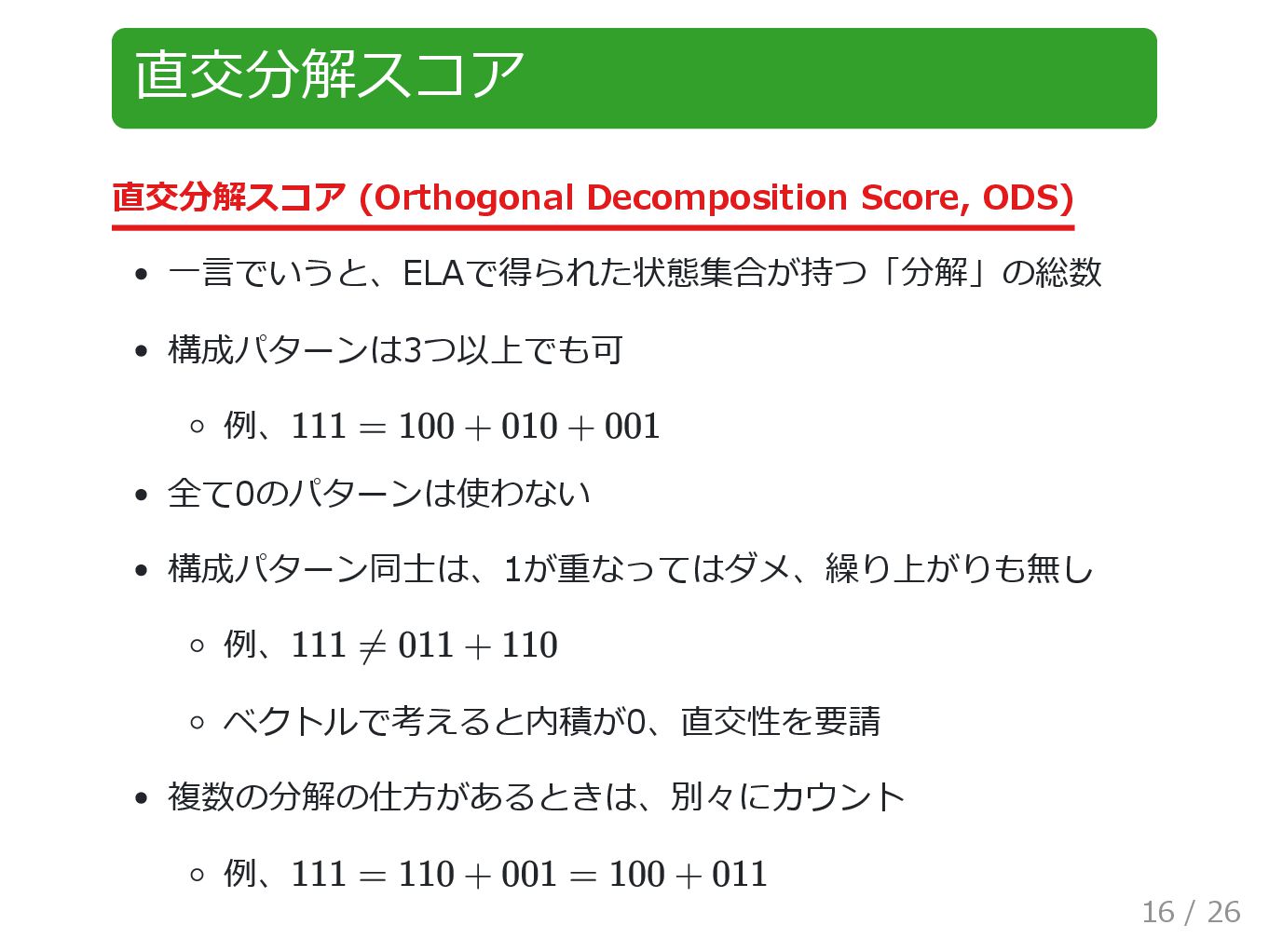 直交分解スコア 直交分解スコア (Orthogonal Decomposition Score, ODS) 一言でいうと、ELAで得られた状態集合が持つ「分解」の総数 構成パターンは3つ以上でも可 例、 全て0のパターンは使わない
