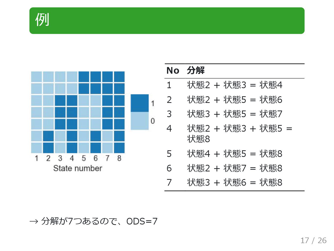 状態2 + 状態5 = 状態6 3 状態3 + 状態5 = 状態7 4 状態2 + 状態3 + 状態5 = 状態8 5 状態4 + 状態5 = 状態8 6 状態2 + 状態7 = 状態8 7 状態3 + 状態6 = 状態8 → 分解が7つあるので、ODS=7 17 / 26