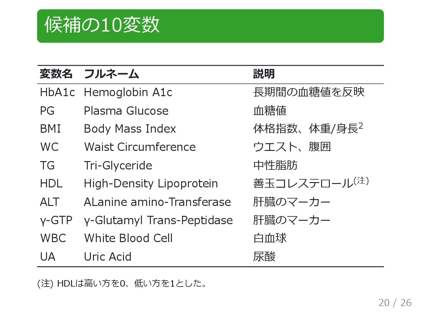 Glucose 血糖値 BMI Body Mass Index 体格指数、体重/身長 WC Waist Circumference ウエスト、腹囲 TG Tri-Glyceride 中性脂肪 HDL High-Density Lipoprotein 善玉コレステロール ALT ALanine amino-Transferase 肝臓のマーカー γ-GTP γ-Glutamyl Trans-Peptidase 肝臓のマーカー WBC White Blood Cell 白血球 UA Uric Acid 尿酸 (注) HDLは高い方を0、低い方を1とした。 2 (注) 20 / 26