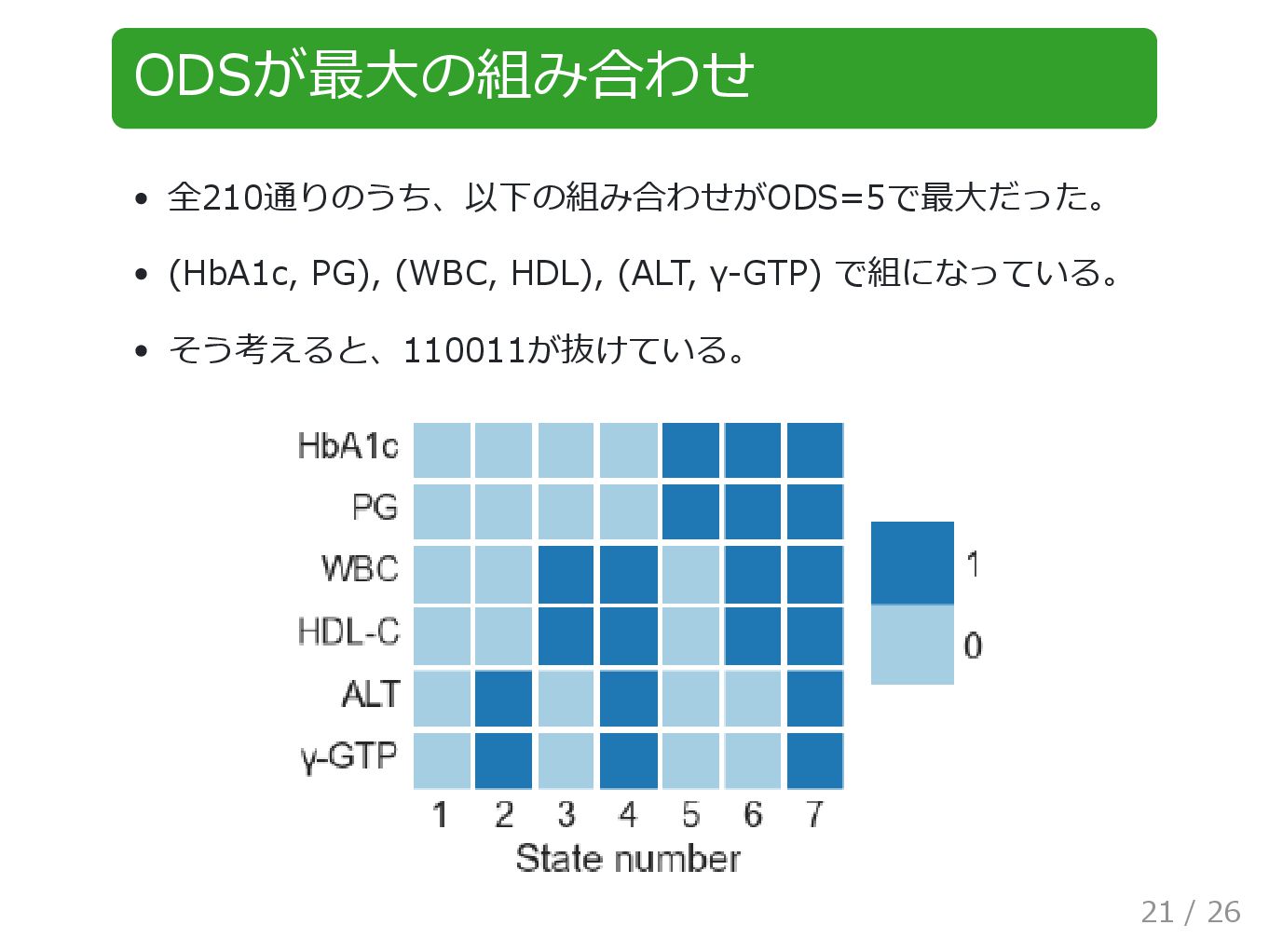 ODSが最大の組み合わせ 全210通りのうち、以下の組み合わせがODS=5で最大だった。 (HbA1c, PG), (WBC, HDL), (ALT, γ-GTP) で組になっている。 そう考えると、110011が抜けている。