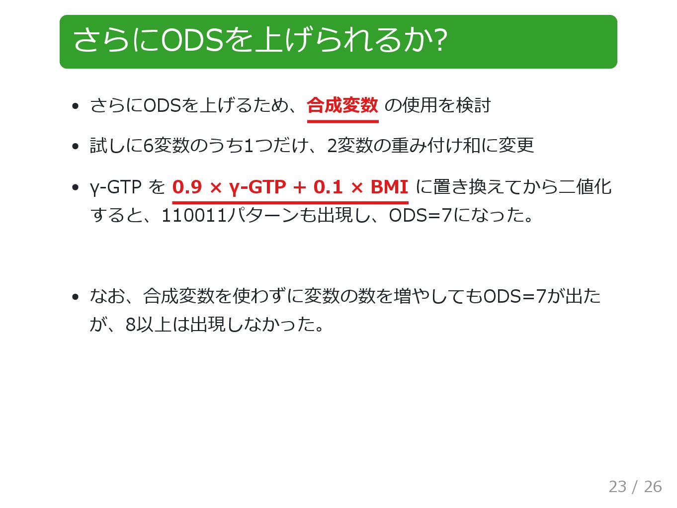 さらにODSを上げられるか? さらにODSを上げるため、合成変数 の使用を検討 試しに6変数のうち1つだけ、2変数の重み付け和に変更 γ-GTP を 0.9 × γ-GTP +