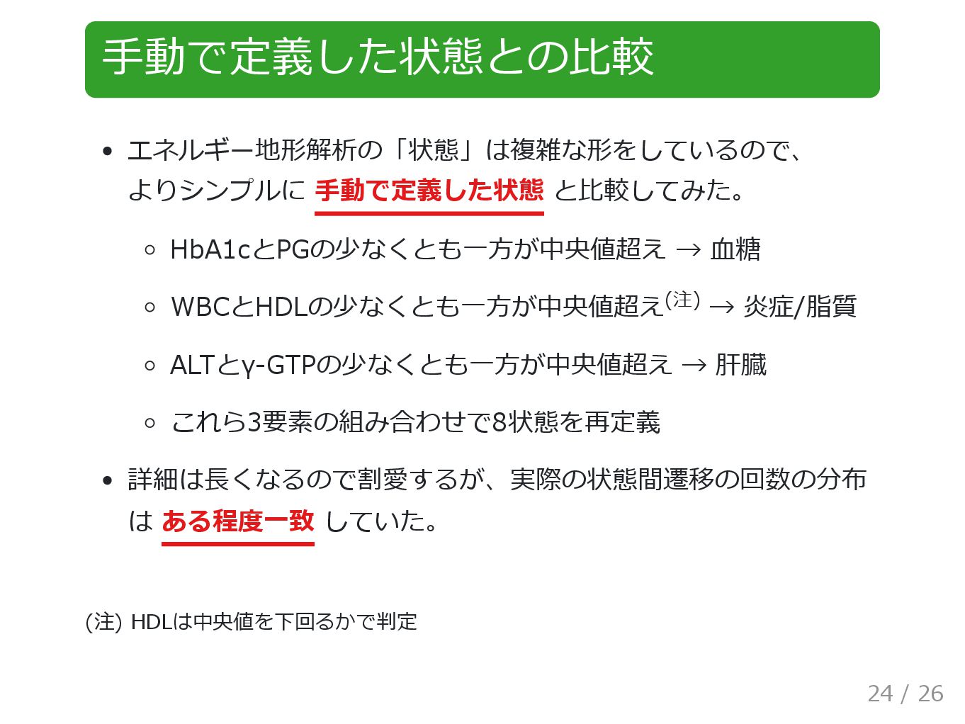炎症/脂質 ALTとγ-GTPの少なくとも一方が中央値超え → 肝臓 これら3要素の組み合わせで8状態を再定義 詳細は長くなるので割愛するが、実際の状態間遷移の回数の分布 は ある程度一致 していた。 (注) HDLは中央値を下回るかで判定 (注) 24 / 26