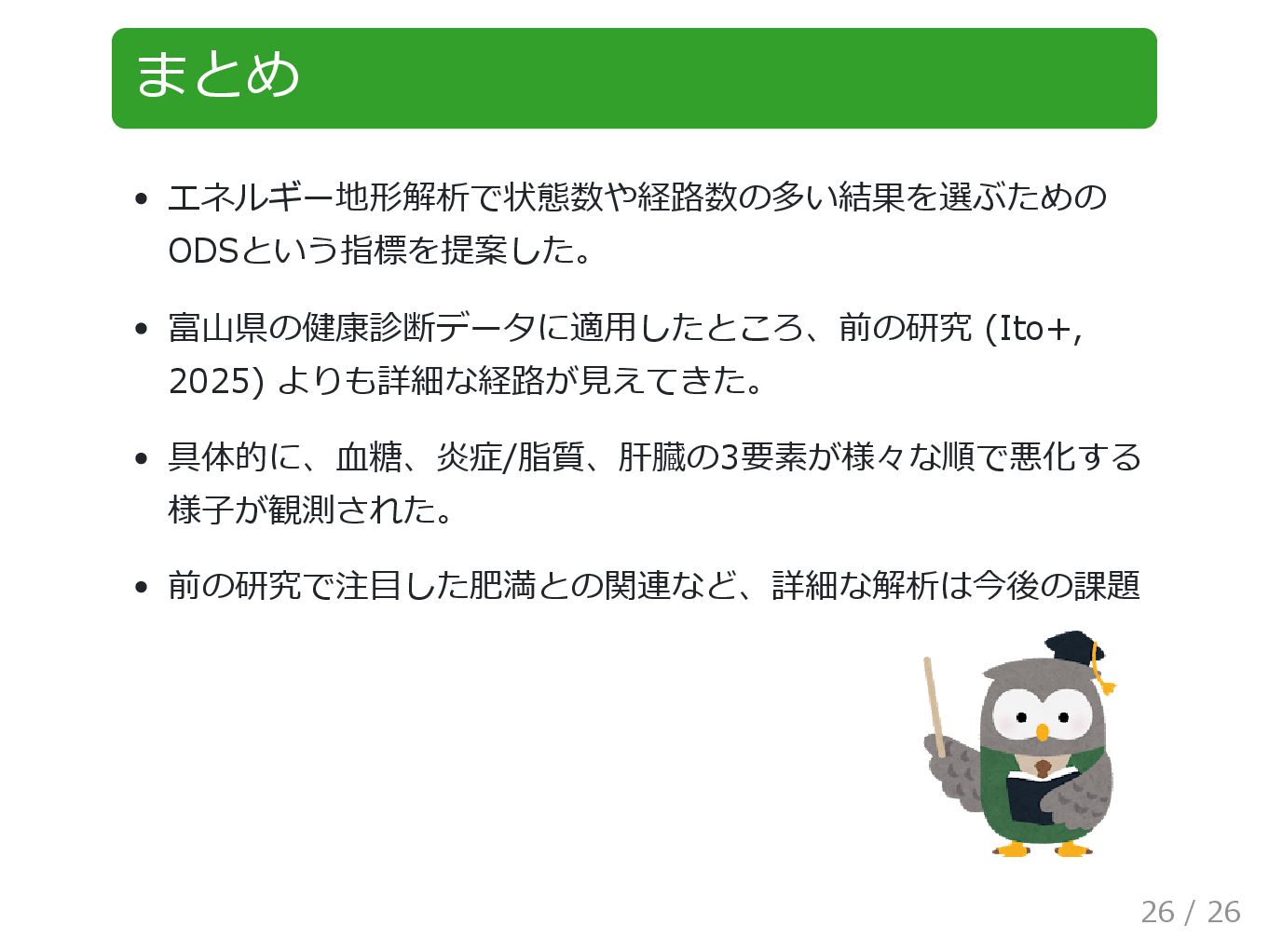 まとめ エネルギー地形解析で状態数や経路数の多い結果を選ぶための ODSという指標を提案した。 富山県の健康診断データに適用したところ、前の研究 (Ito+, 2025) よりも詳細な経路が見えてきた。 具体的に、血糖、炎症/脂質、肝臓の3要素が様々な順で悪化する 様子が観測された。 前の研究で注目した肥満との関連など、詳細な解析は今後の課題