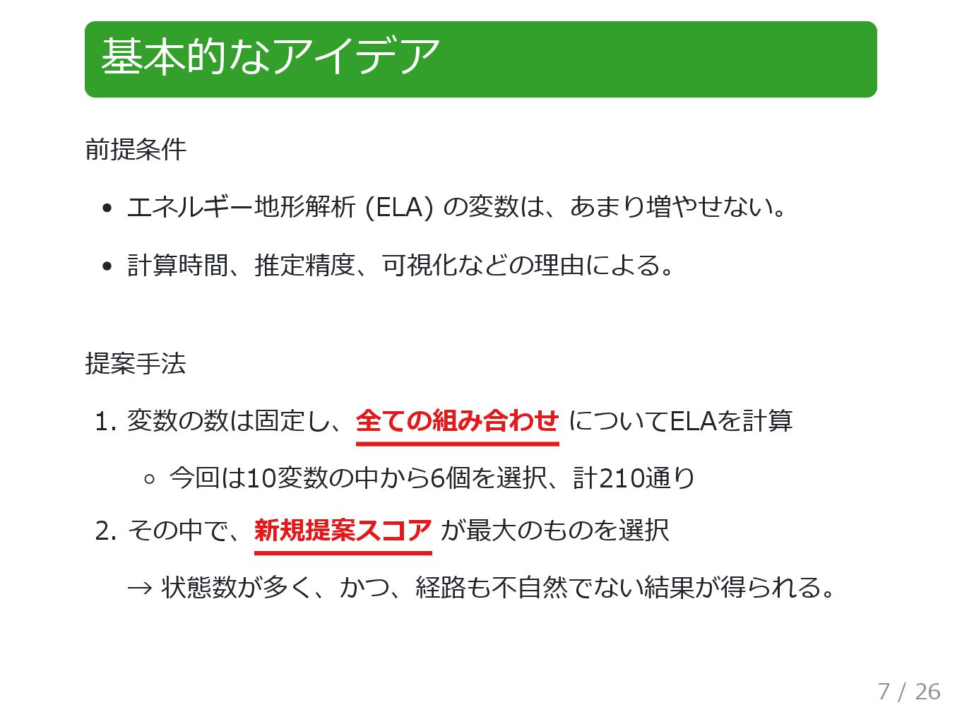 今回は10変数の中から6個を選択、計210通り 2. その中で、新規提案スコア が最大のものを選択 → 状態数が多く、かつ、経路も不自然でない結果が得られる。 7 / 26