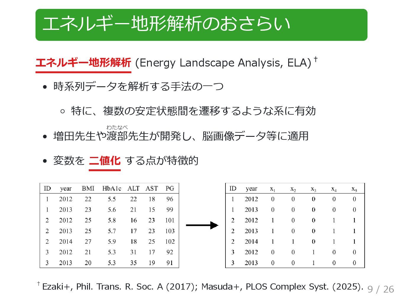 変数を 二値化 する点が特徴的 Ezaki+, Phil. Trans. R. Soc. A (2017); Masuda+, PLOS Complex Syst. (2025). † † 9 / 26