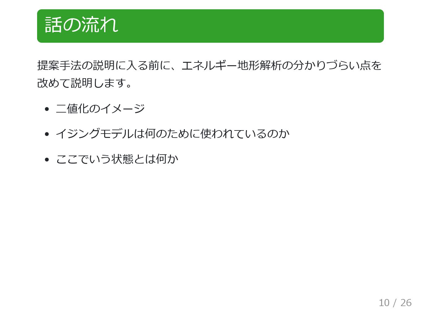 話の流れ 提案手法の説明に入る前に、エネルギー地形解析の分かりづらい点を 改めて説明します。 二値化のイメージ イジングモデルは何のために使われているのか ここでいう状態とは何か 10 / 26