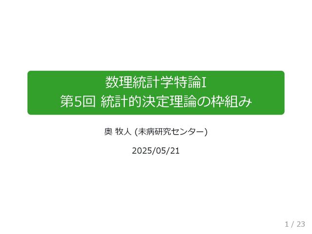数理統計学特論I 第5回 統計的決定理論の枠組み 奥 牧人 (未病研究センター) 2025/05/21 1 / 23