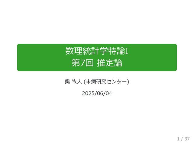 は UMVU である N (μ, σ 2 ) T1 = n ∑ i=1 Xi , T2 = n ∑ i=1 X 2 i ¯ X s 2 T = (T1 , T2 ) ¯ X = T1 n , s 2 = T2 − T 2 1 /n n − 1 ¯ X s 2 E[ ¯ X] = μ, E[s 2 ] = σ 2 ¯ X s 2 22 / 37