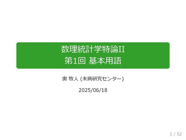 数理統計学特論II 第1回 基本用語 奥 牧人 (未病研究センター) 2025/06/18 1 / 52