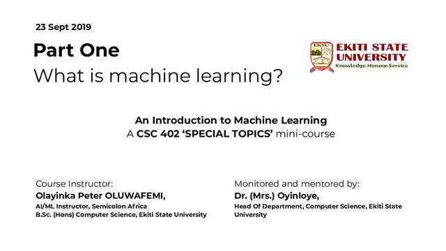(Hons) Computer Science, Ekiti State University Monitored and mentored by: Dr. (Mrs.) Oyinloye, Head Of Department, Computer Science, Ekiti State University Part One What is machine learning? An Introduction to Machine Learning A CSC 402 ‘SPECIAL TOPICS’ mini-course 23 Sept 2019