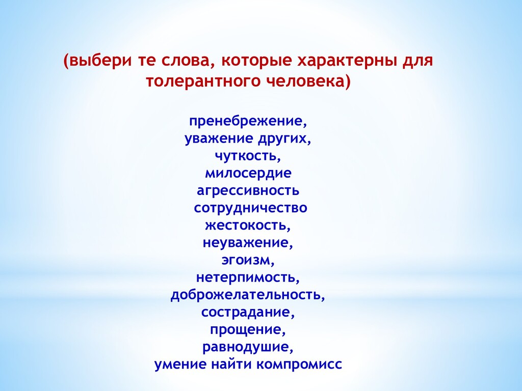 (выбери те слова, которые характерны для толерантного человека) пренебрежение, уважение