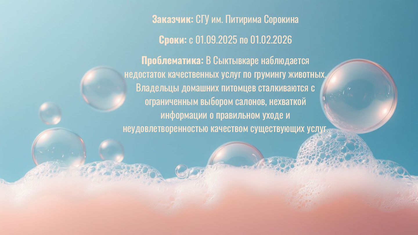 Проблематика: В Сыктывкаре наблюдается недостаток качественных услуг по грумингу животных. Владельцы домашних питомцев сталкиваются с ограниченным выбором салонов, нехваткой информации о правильном уходе и неудовлетворенностью качеством существующих услуг.