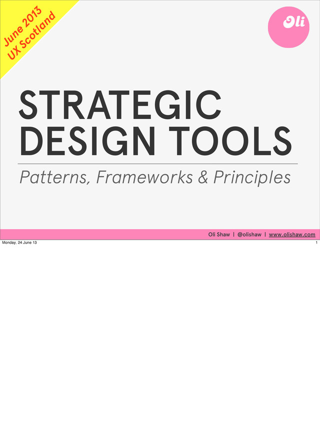 "This talk covers how to create a strategic vision for a product / service, and then take that vision though a series of strategic design tools to guide its journey though production to release.