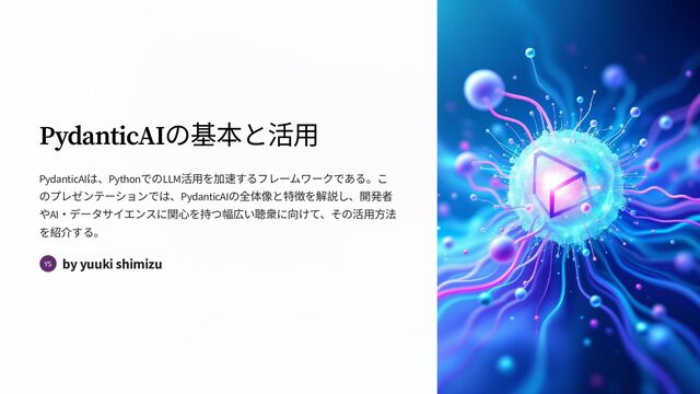 PydanticAIの基本と活⽤ PydanticAIは、PythonでのLLM活⽤を加速するフレームワークである。こ のプレゼンテーションでは、PydanticAIの全体像と特徴を解説し、開発者 やAI·データサイエンスに関⼼を持つ幅広い聴衆に向けて、その活⽤⽅法 を紹介する。 by yuuki shimizu YS