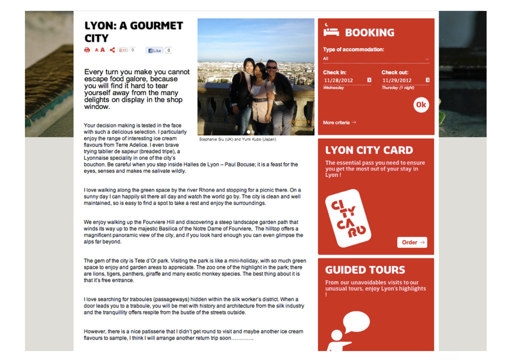 During many years DMO (Destination Management Organization) have though that they have the expertise on all topics about their cities… Taking into consideration a few years ago that it was not the case, OnlyLyon Tourism has decided to focus his strategy on the contribution of local experts, inhabitant fans of their city and visitors seduced by their stay. Many actions of OnlyLyon Tourism like their travel guide, website, greeters… are now the concrete application of this global strategy.