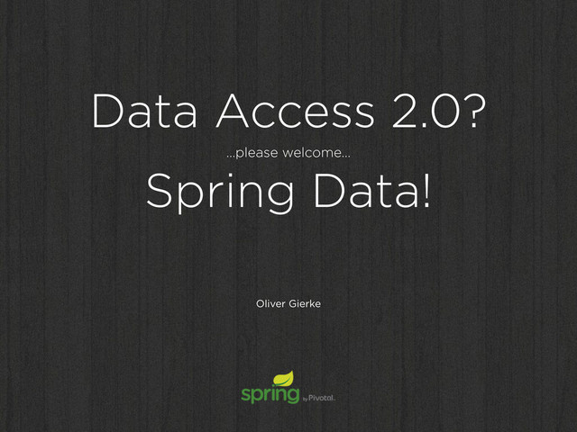 Mongo(); MongoDbFactory factory = new SimpleMongoDbFactory(mongo, „foo“); MongoTemplate template = new MongoTemplate(factory); // Create and save entity Person dave = new Person("Dave", "Matthews"); dave.setEmailAddress("[email protected]"); template.save(person); // Query entity Query query = new Query(new Criteria("emailAddress") .is("[email protected]")); assertThat(template.findOne(query, Person.class), is(dave));