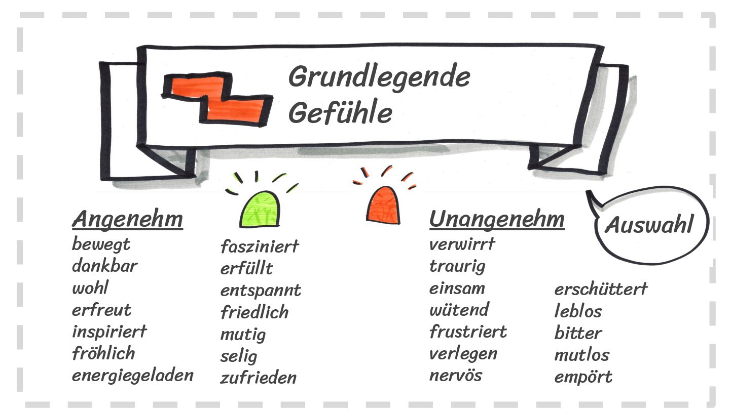 Grundlegende Gefühle Auswahl Angenehm bewegt dankbar wohl erfreut inspiriert fröhlich