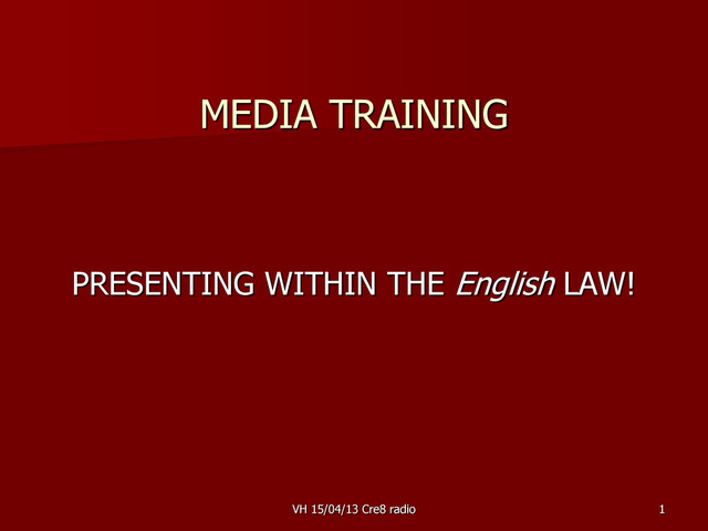 Victims of Sexual Offences Jigsaw identification Reporting Restrictions Children and the Law Copyright and other intellectual property rights Data Protection Act VH 15/04/13 Cre8 radio