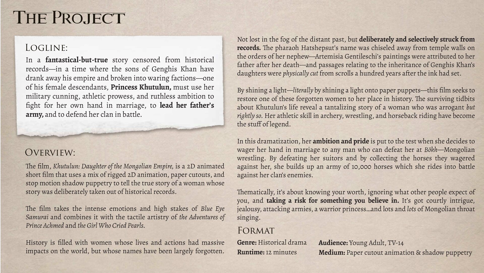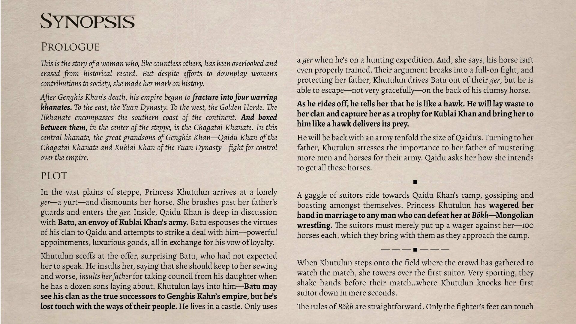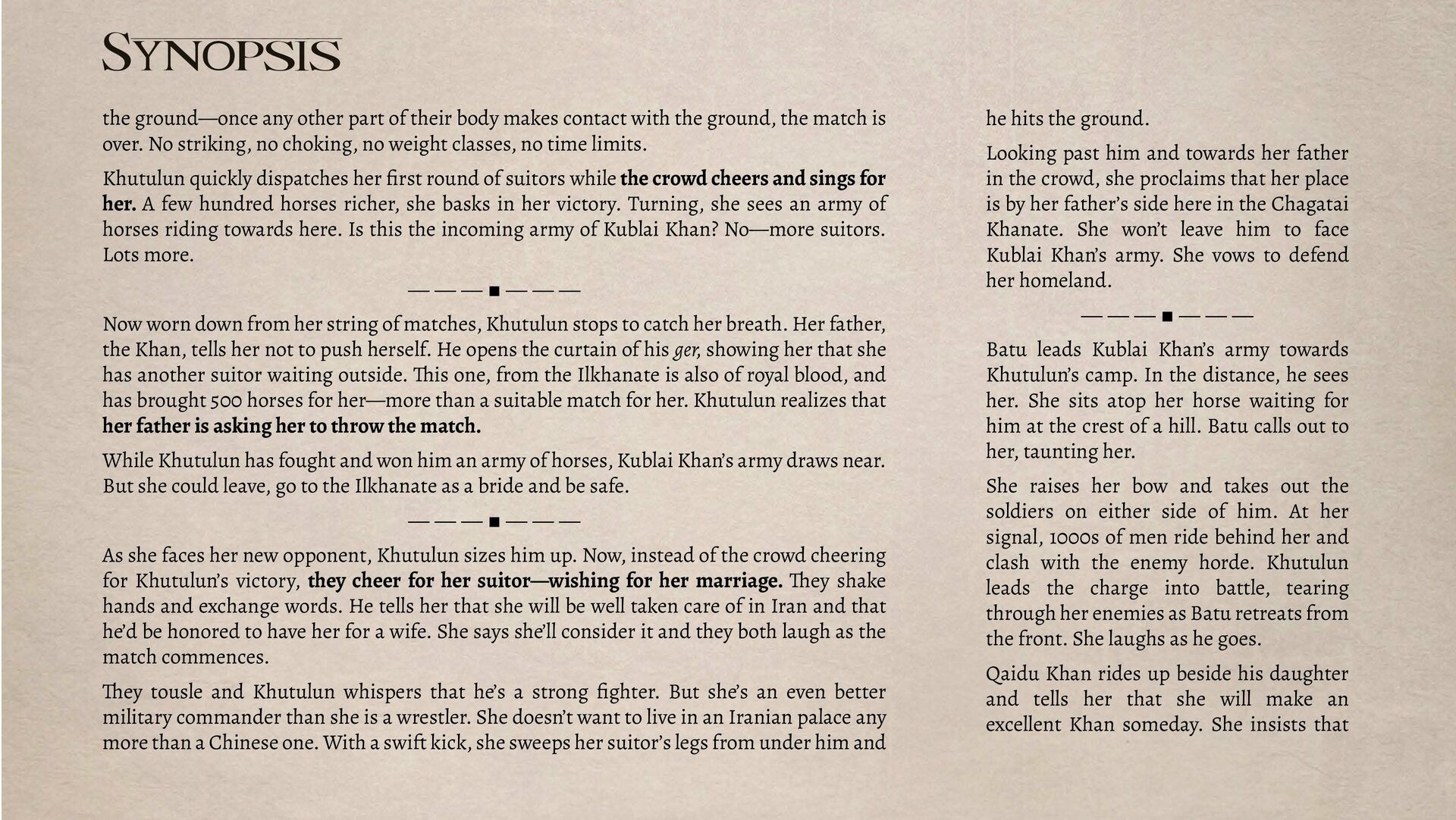In a fantastical-but-true story censored from historical records—in a time where the sons of Genghis Khan have drank away his empire and broken into waring factions—one of his female descendants, Princess Khutulun, must use her military cunning, athletic prowess, and ruthless ambition to fight for her own hand in marriage, to lead her father’s army, and to defend her clan in battle.