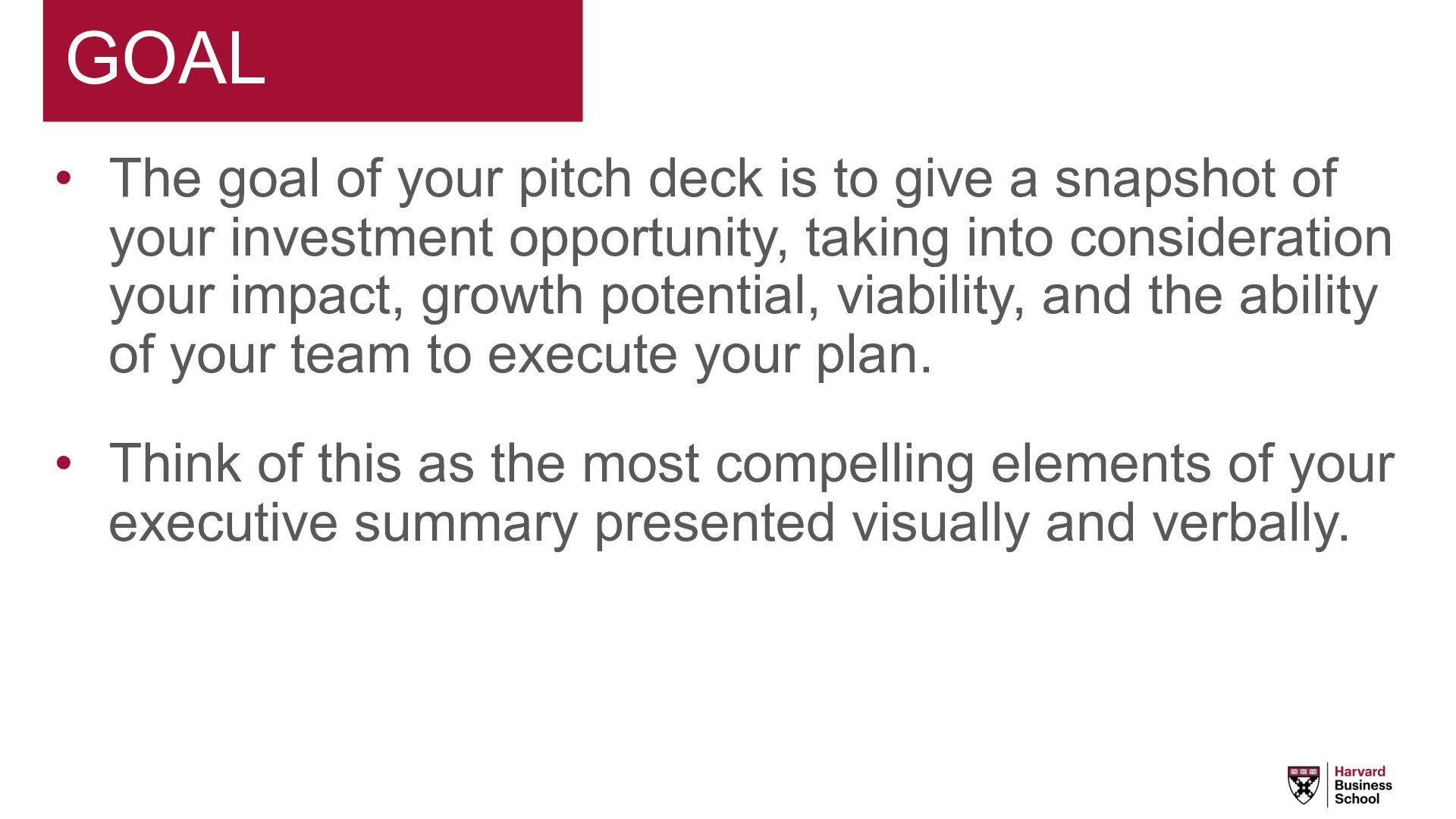 give a snapshot of your investment opportunity, taking into consideration your impact, growth potential, viability, and the ability of your team to execute your plan. • Think of this as the most compelling elements of your executive summary presented visually and verbally.