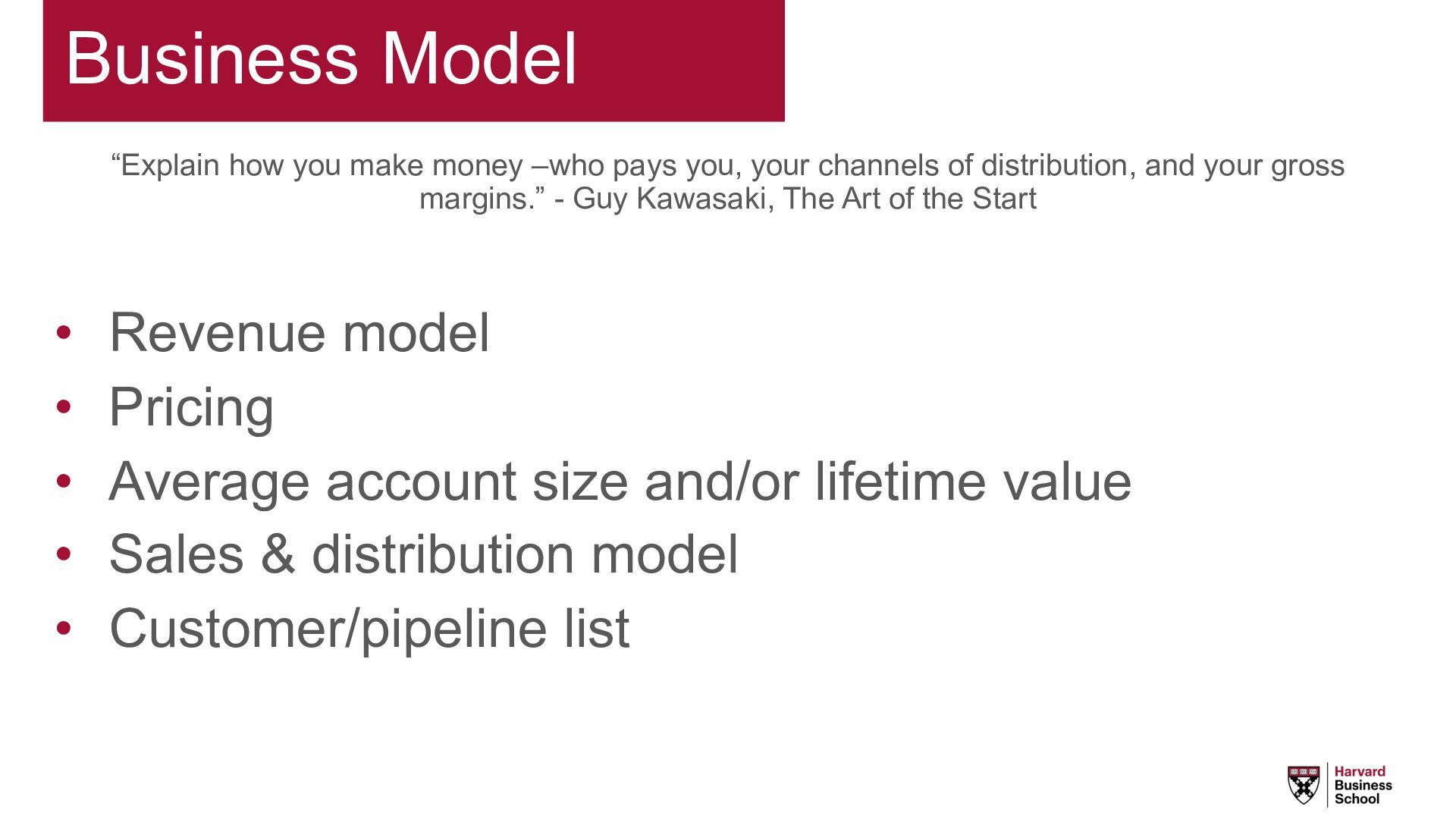 your channels of distribution, and your gross margins.” - Guy Kawasaki, The Art of the Start • Revenue model • Pricing • Average account size and/or lifetime value • Sales & distribution model • Customer/pipeline list