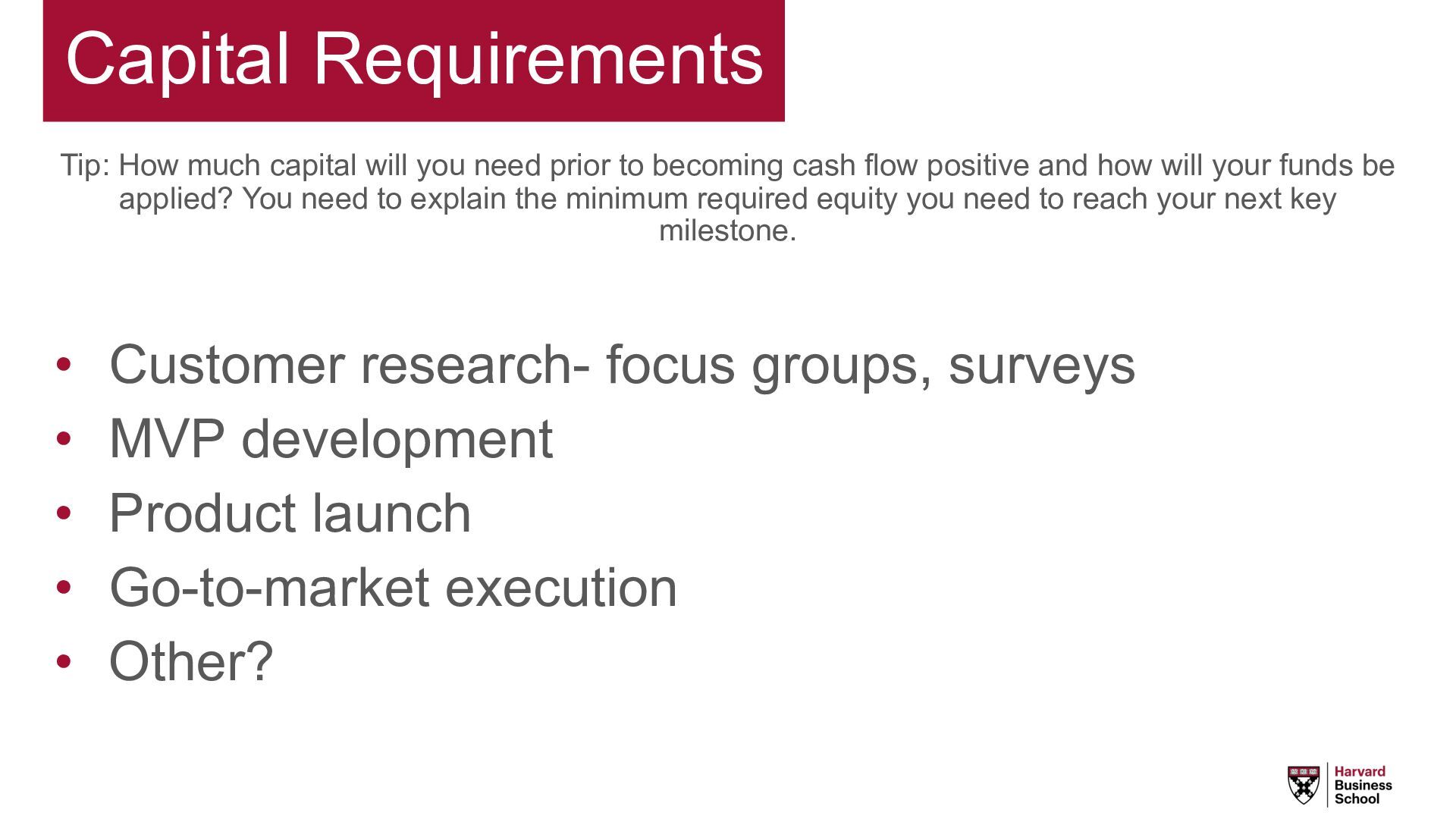 to becoming cash flow positive and how will your funds be applied? You need to explain the minimum required equity you need to reach your next key milestone. • Customer research- focus groups, surveys • MVP development • Product launch • Go-to-market execution • Other?