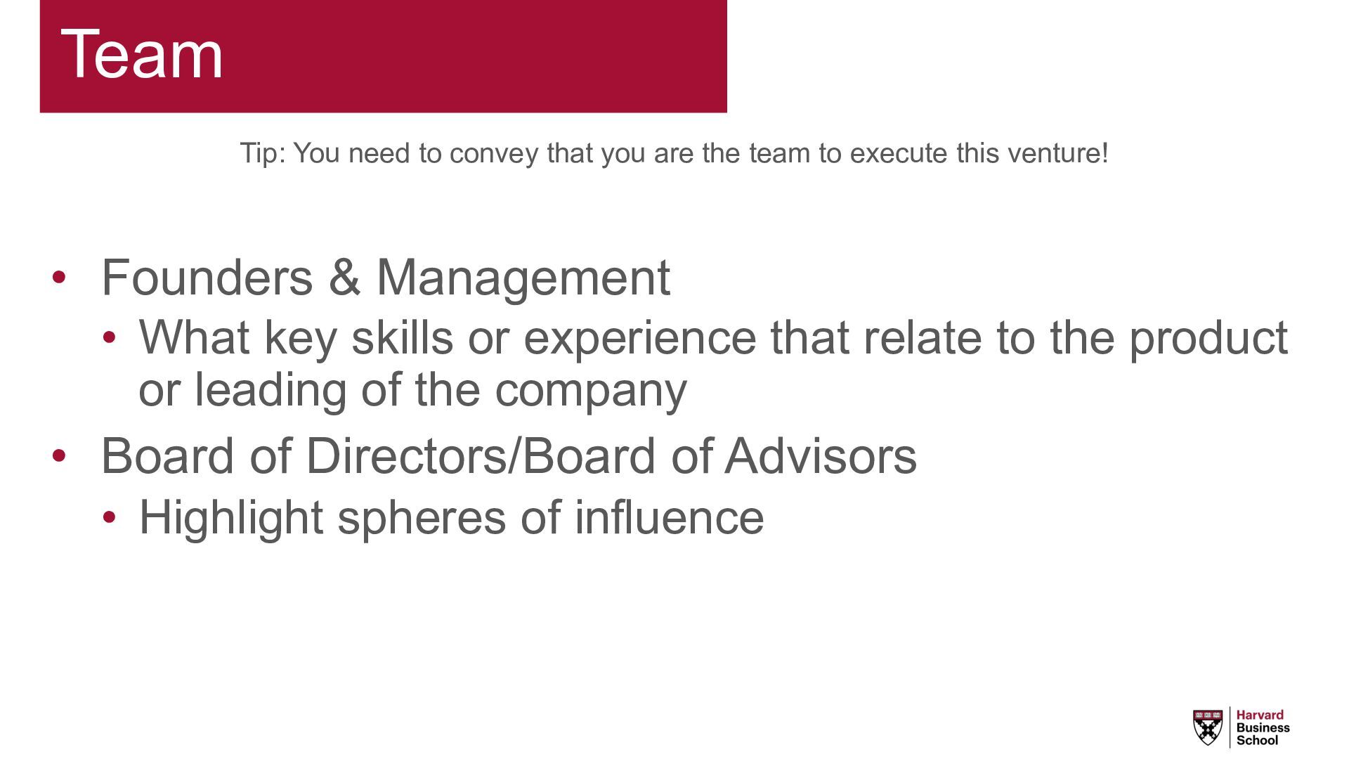 team to execute this venture! • Founders & Management • What key skills or experience that relate to the product or leading of the company • Board of Directors/Board of Advisors • Highlight spheres of influence