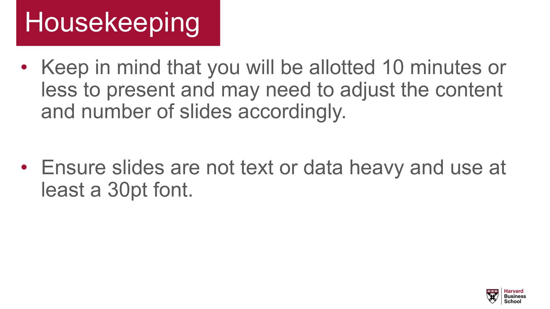 10 minutes or less to present and may need to adjust the content and number of slides accordingly. • Ensure slides are not text or data heavy and use at least a 30pt font.
