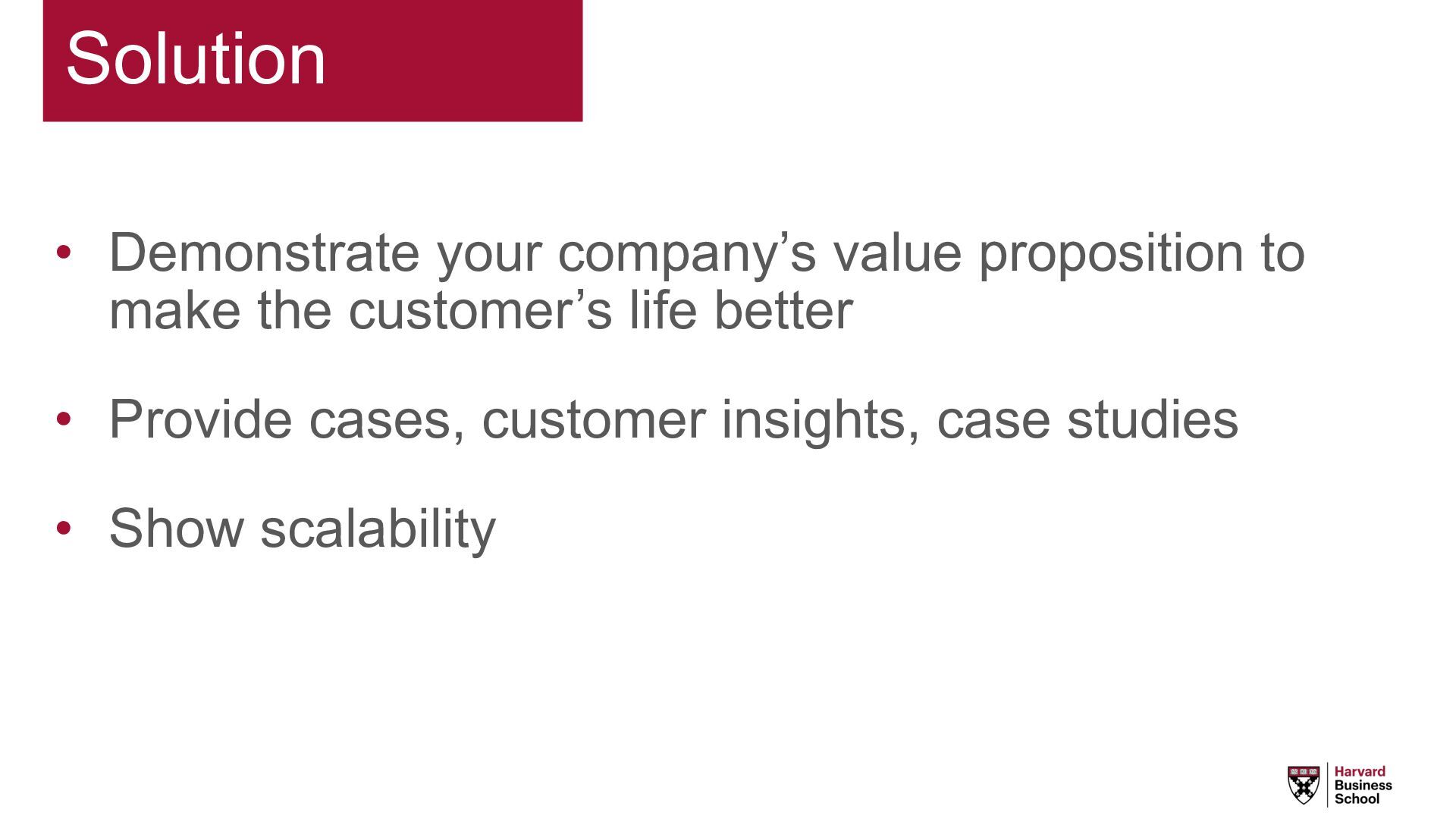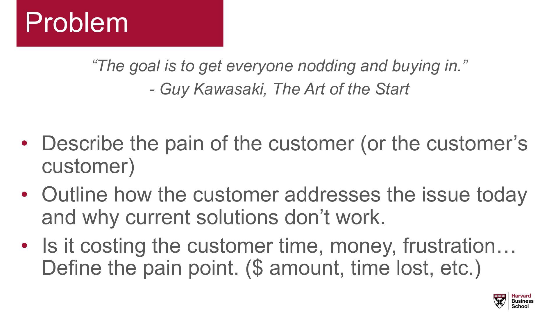 in.” - Guy Kawasaki, The Art of the Start • Describe the pain of the customer (or the customer’s customer) • Outline how the customer addresses the issue today and why current solutions don’t work. • Is it costing the customer time, money, frustration… Define the pain point. ($ amount, time lost, etc.)