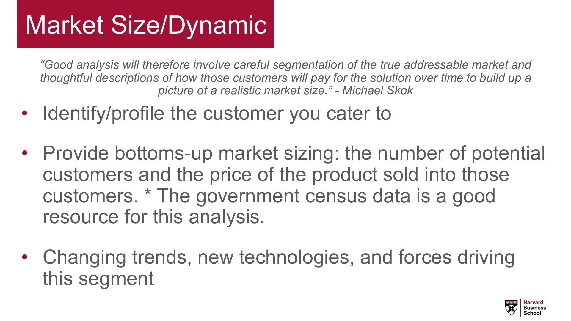 the true addressable market and thoughtful descriptions of how those customers will pay for the solution over time to build up a picture of a realistic market size.” - Michael Skok • Identify/profile the customer you cater to • Provide bottoms-up market sizing: the number of potential customers and the price of the product sold into those customers. * The government census data is a good resource for this analysis. • Changing trends, new technologies, and forces driving this segment