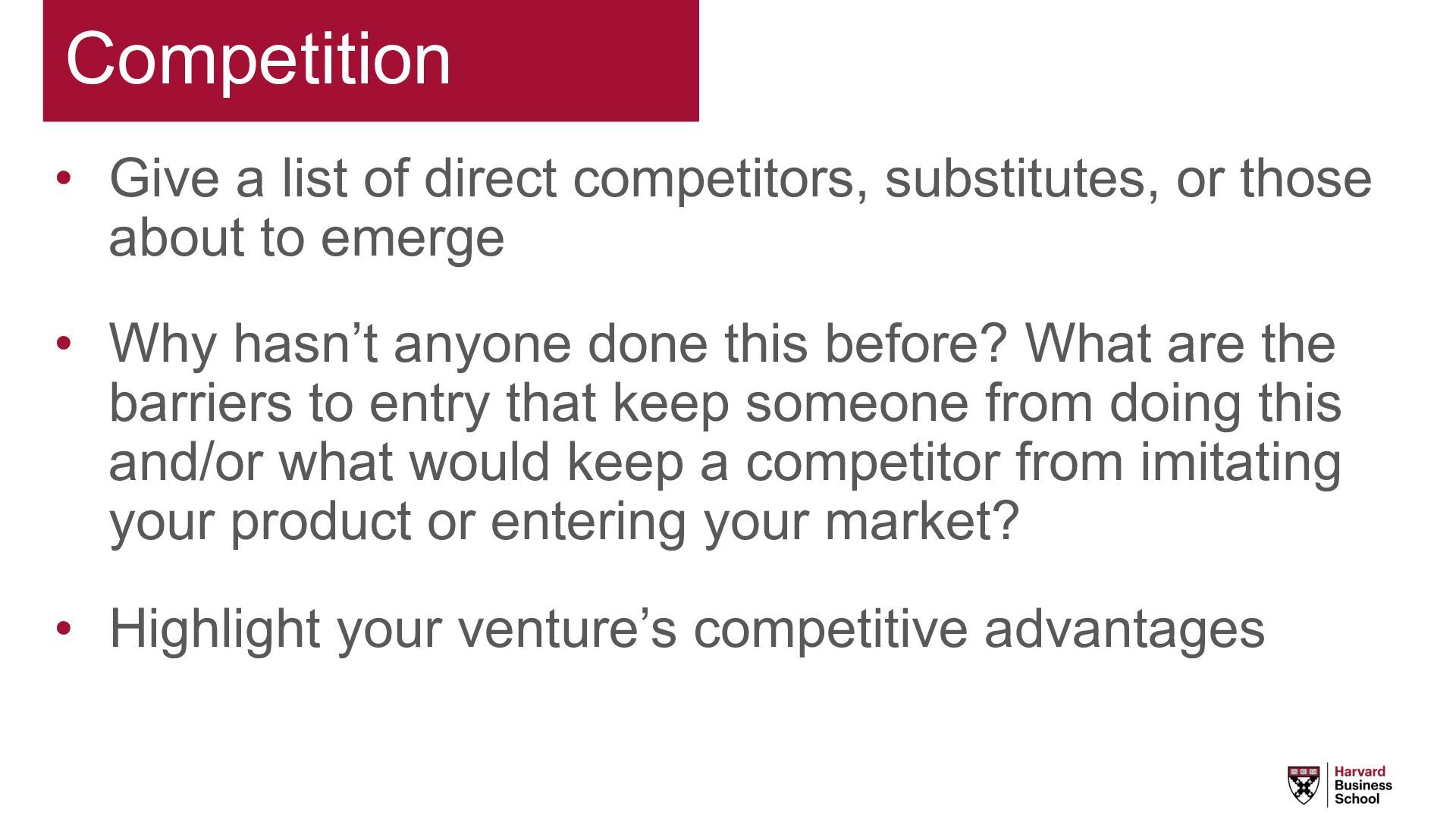 those about to emerge • Why hasn’t anyone done this before? What are the barriers to entry that keep someone from doing this and/or what would keep a competitor from imitating your product or entering your market? • Highlight your venture’s competitive advantages