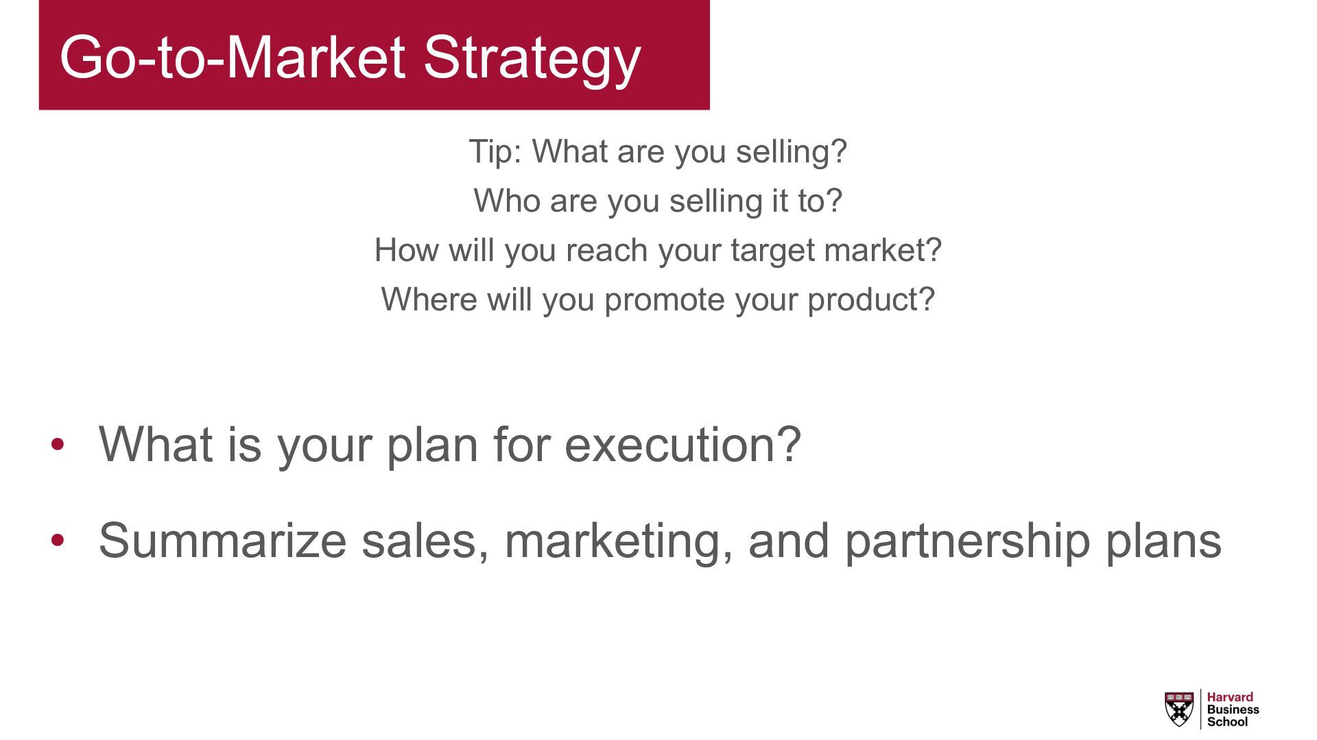 selling it to? How will you reach your target market? Where will you promote your product? • What is your plan for execution? • Summarize sales, marketing, and partnership plans