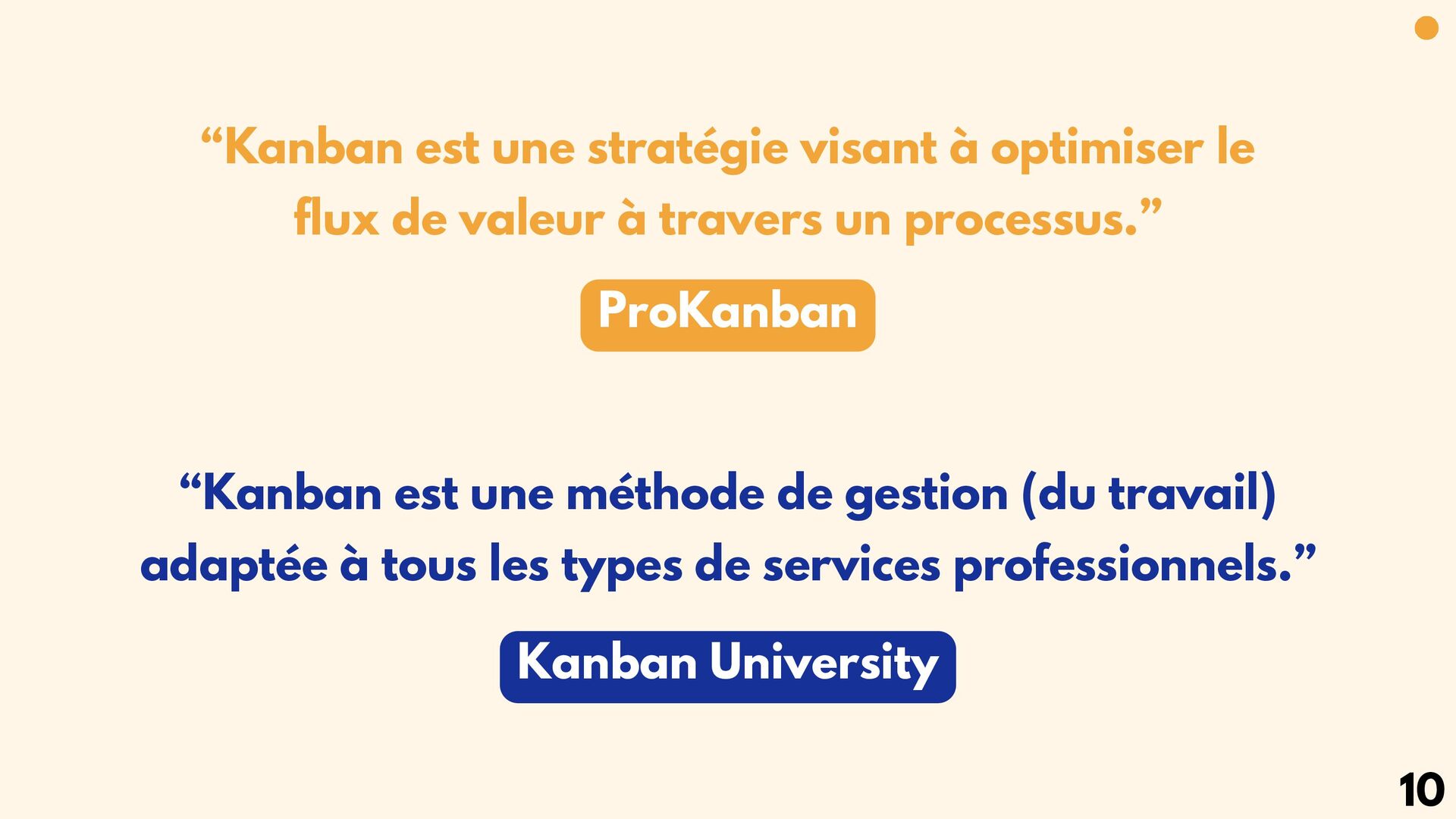 de valeur à travers un processus.” ProKanban “Kanban est une méthode de gestion (du travail) adaptée à tous les types de services professionnels.” Kanban University