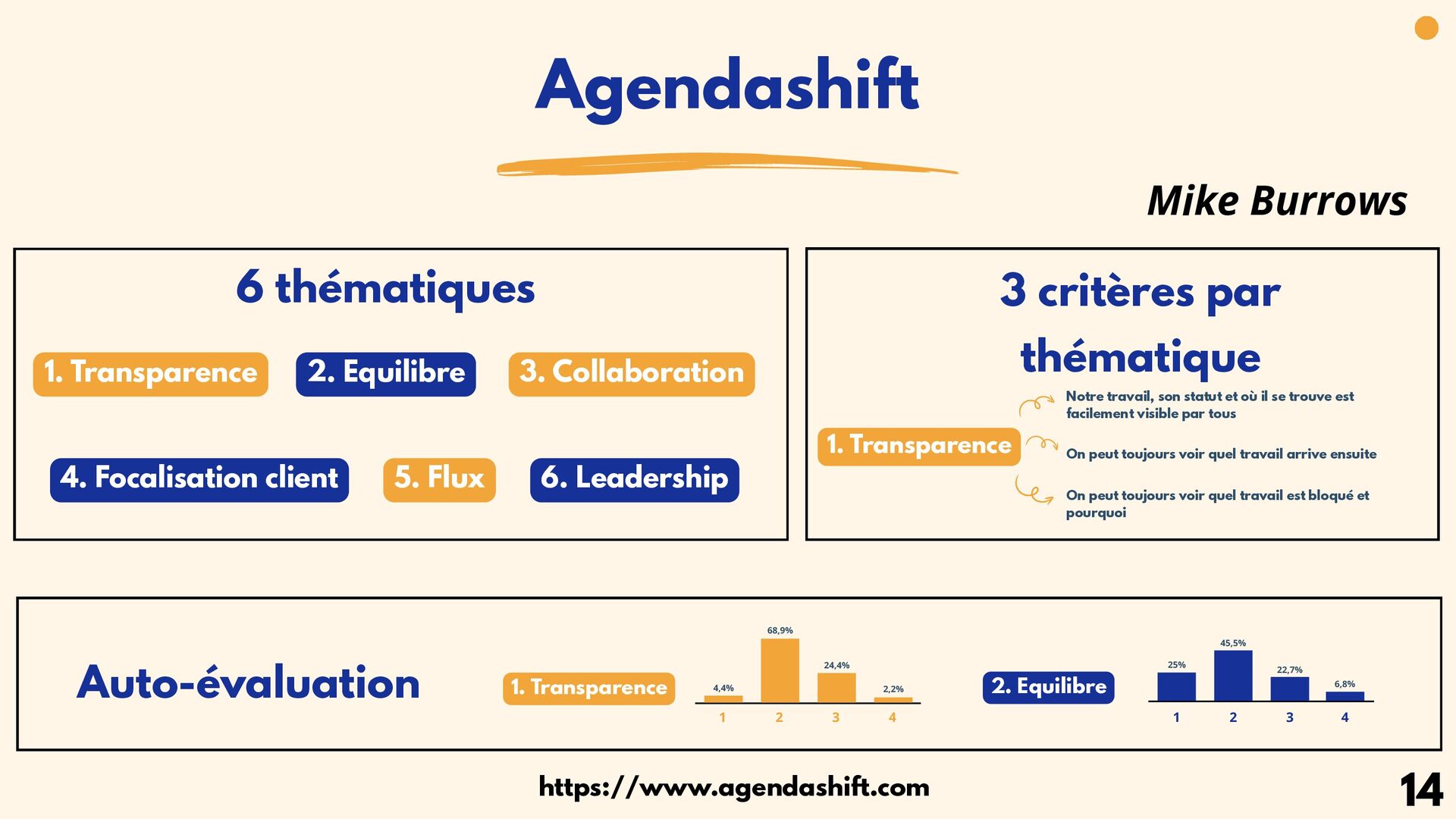 Equilibre 4. Focalisation client 6. Leadership 1. Transparence Notre travail, son statut et où il se trouve est facilement visible par tous On peut toujours voir quel travail arrive ensuite On peut toujours voir quel travail est bloqué et pourquoi 3 critères par thématique 1 2 3 4 1 2 3 4 1. Transparence 2. Equilibre 4,4% 68,9% 24,4% 2,2% 25% 45,5% 22,7% 6,8% Auto-évaluation Mike Burrows https://www.agendashift.com 14