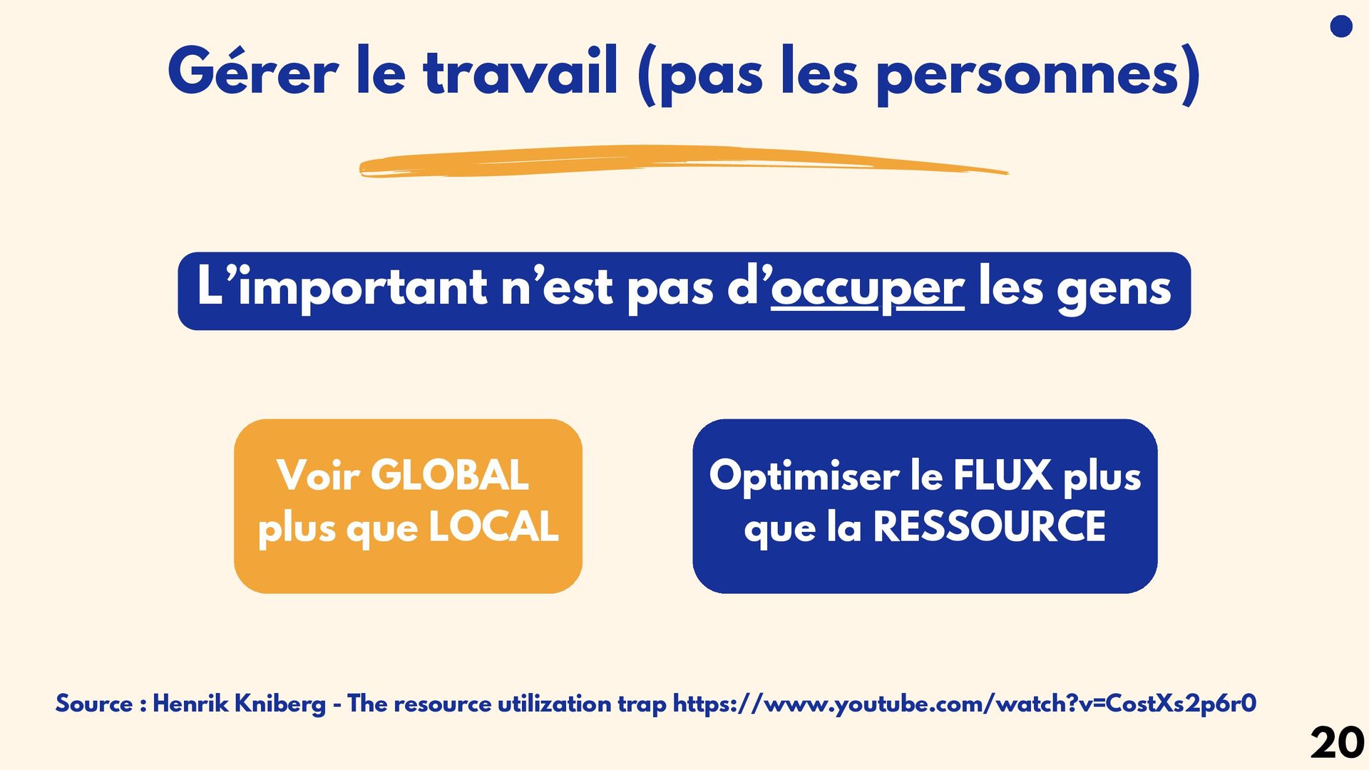- The resource utilization trap https://www.youtube.com/watch?v=CostXs2p6r0 20 Voir GLOBAL plus que LOCAL Optimiser le FLUX plus que la RESSOURCE L’important n’est pas d’occuper les gens