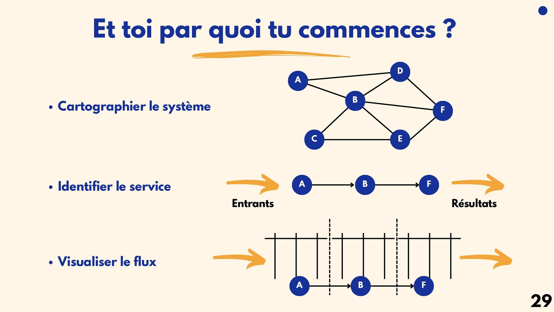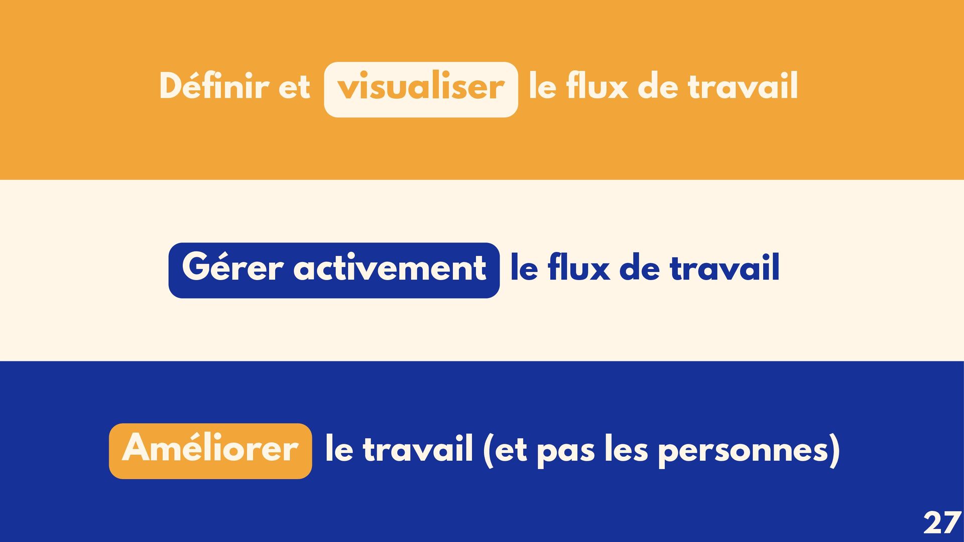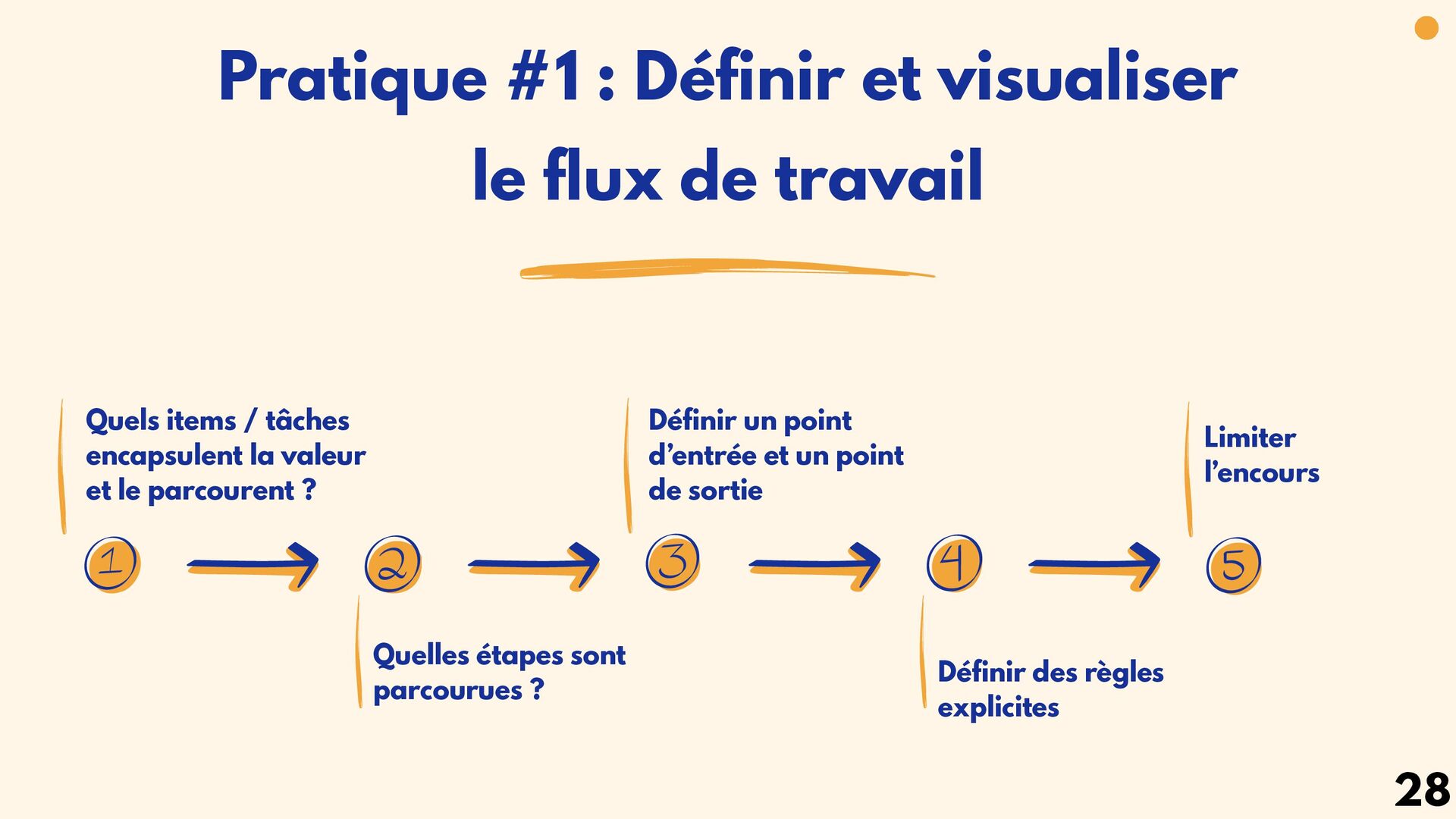 Quels items / tâches encapsulent la valeur et le parcourent ? Quelles étapes sont parcourues ? Définir un point d’entrée et un point de sortie Définir des règles explicites Limiter l’encours 28
