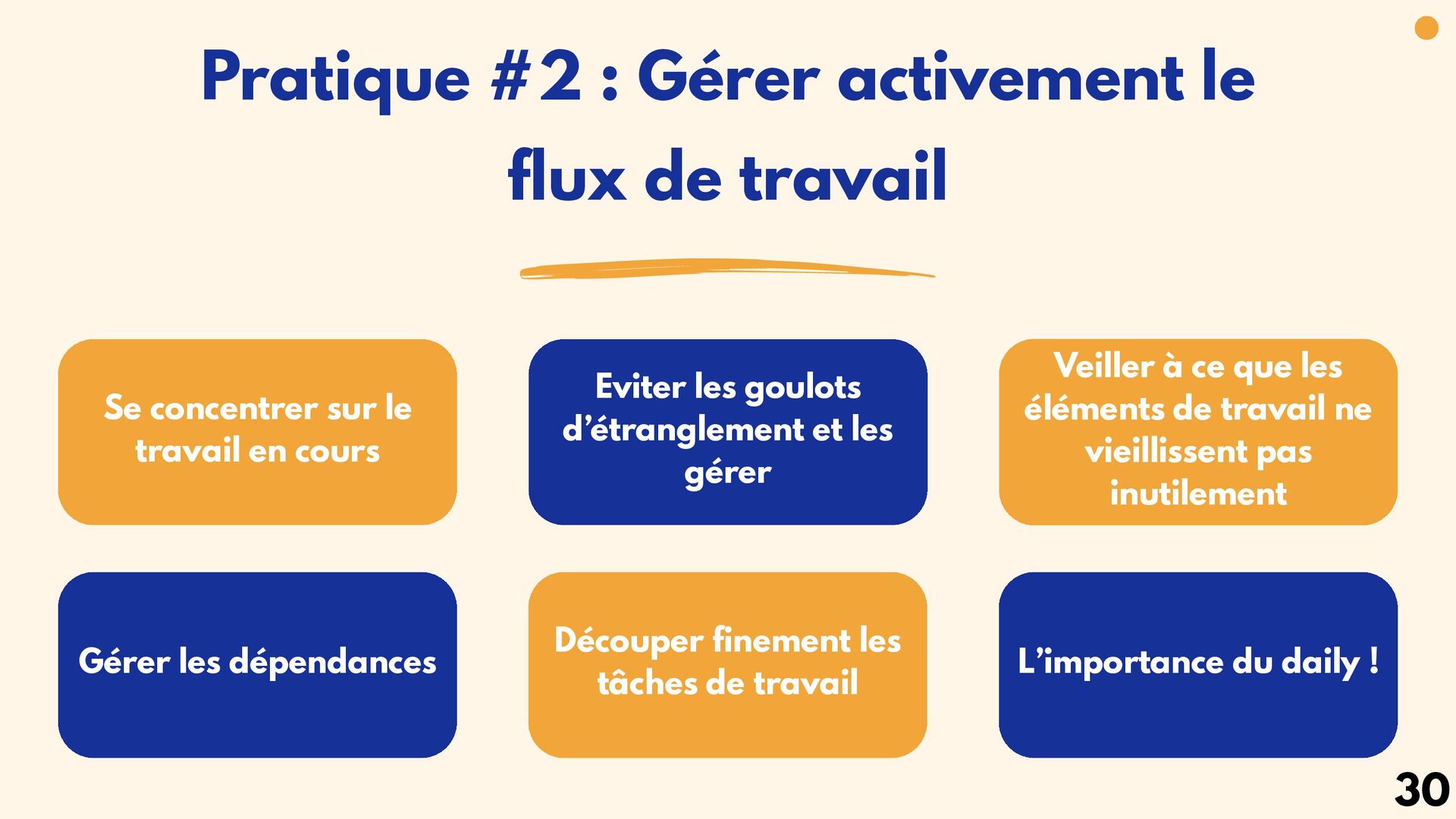 concentrer sur le travail en cours Eviter les goulots d’étranglement et les gérer Veiller à ce que les éléments de travail ne vieillissent pas inutilement Gérer les dépendances Découper finement les tâches de travail L’importance du daily ! 30