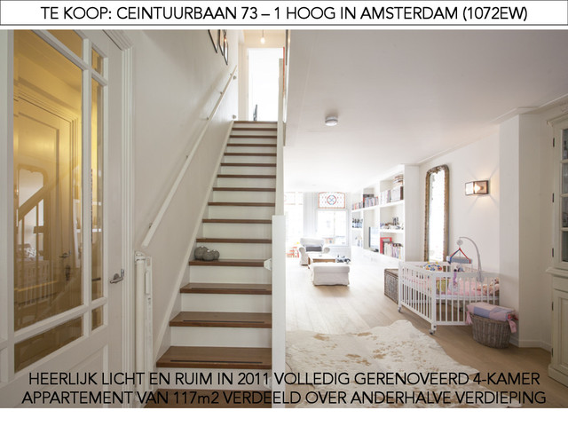 APPARTEMENT VAN 117m2 VERDEELD OVER ANDERHALVE VERDIEPING Omschrijving Een topappartement dat van alle gemakken is voorzien, op eigen grond gelegen aan de Ceintuurbaan en vlakbij het Sarphatipark en de Albert Cuyp. Deze woning is uitzonderlijk goed ingedeeld en van alle comfort voorzien, maar met behoud van originele details (zoals glas-in-lood aan voorzijde). De woning is zeer ruim mede dankzij de hoge plafonds en deuren. Naast heerlijk ruimtelijk is het ook een heel lichte woning. Deze woning is niet alleen uitermate geschikt voor gebruik door een stel of (jong) gezin, maar ook zeker voor studenten. Indeling Entree/hal met meterkast, intercom/videofoon installatie, ruime gangkast en van de woonkamer gescheiden toilet (zwevend toilet met fontein). Eerste slaap/werkkamer aan voorzijde. Ruime woonkamer over de hele lengte van het huis (15m) met aangebouwde serre en een half open keuken. De luxe keuken is voorzien van diverse inbouwapparatuur, zoals; vaatwasmachine, 5-pits gasfornuis, ijskast, vriezer en ruim voldoende kastruimte. Klein balkon met gangkast wat toegang biedt tot buitenterras aan de achterzijde. Via de trap binnendoor bereikt u de tweede verdieping. De tweede en derde slaapkamer zijn gelegen aan de voorzijde. De masterbedroom beschikt over openslaande deuren naar een frans balkon. De moderne badkamer heeft een ligbad, aparte douche, zwevend 2de toilet, handdoek-radiator en fraai badkamermeubel. Apart bevindt zich op deze verdieping een ruimte voorzien van motor voor de mechanische ventilatie, CV-ketel (HR uit 2008) en aansluitingen voor was- en droog-machine. Omgeving Het appartement ligt middenin de Pijp, tussen het Sarphatipark en de Hobbemakade. Op loopafstand bevinden zich het Museumplein, de Beethovenstraat, de Albert Cuypmarkt en de vele cafés en restaurants. De bereikbaarheid is zowel per auto als per openbaarvervoer erg goed. De haltes voor tram 3 en 12 bevinden zich in de directe nabijheid. Op 200 meter zal het nieuwe station Ferdinand Bolstraat van de Noord-Zuid lijn worden geopend. Dit deel van de Ceintuurbaan wordt onderdeel van het project Rode Loper. Bijzonderheden - Fraaie lamelparket vloer door de gehele woning - Mechanische ventilatie voor altijd frisse lucht - Zeer goede geluids- en warmte-isolatie (HR++)