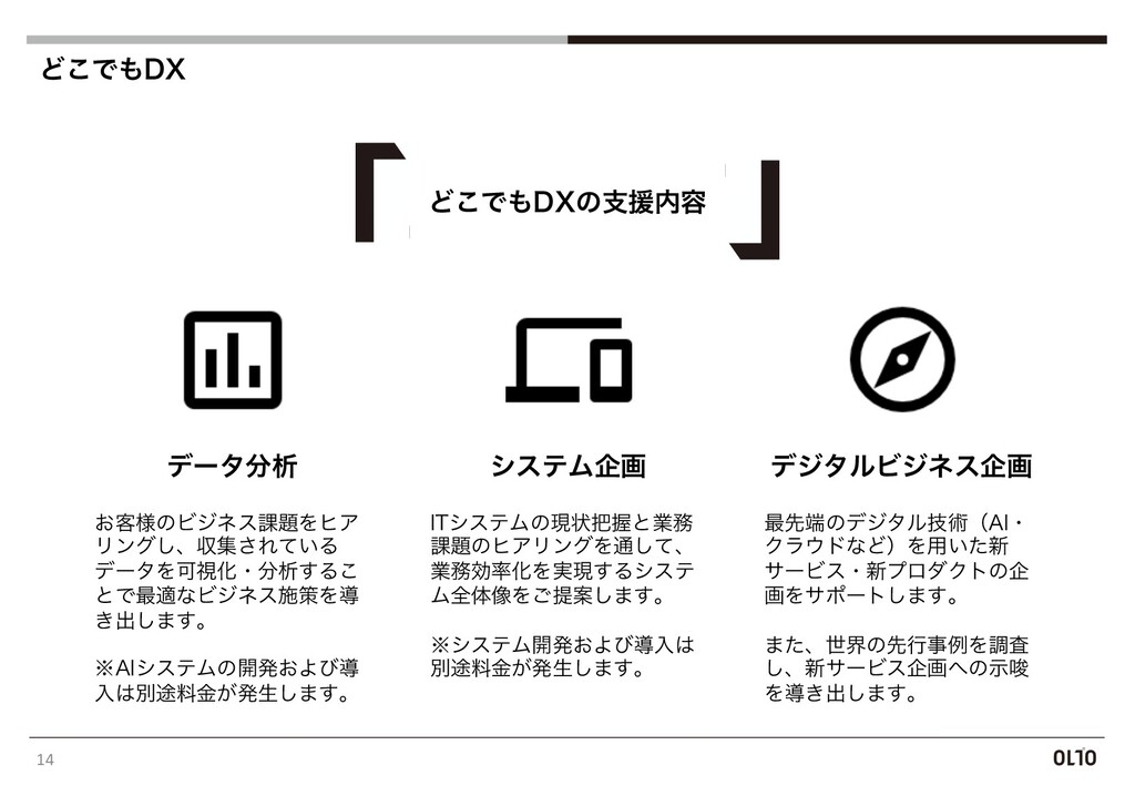 0-50αʔϏεϝχϡʔ σʔλੳίϯαϧςΟϯά γεςϜίϯαϧςΟϯάʗγεςϜ։ൃ Ϗδωε՝ͷಛఆ͔Βੳ࣮ɺϏδωεద༻·ͰϫϯετοϓͰࢧԉ ۀޮԽΛ࣮ݱ͢Δ *5ج൫Λߏங͠ɺϏδωεΛߋʹڧԽ Ͳ͜Ͱ%9 ϦϞʔτͰ%9ͷϓϩʹ૬ஊͰ͖ΔϥΠτͳ%9ࢧԉαʔϏε σδλϧσΟεϥϓγϣϯͷڴҖʹରͯ͠ɺ0-50ͭͷղܾࡦΛఏڙ͠·͢ɻ 6