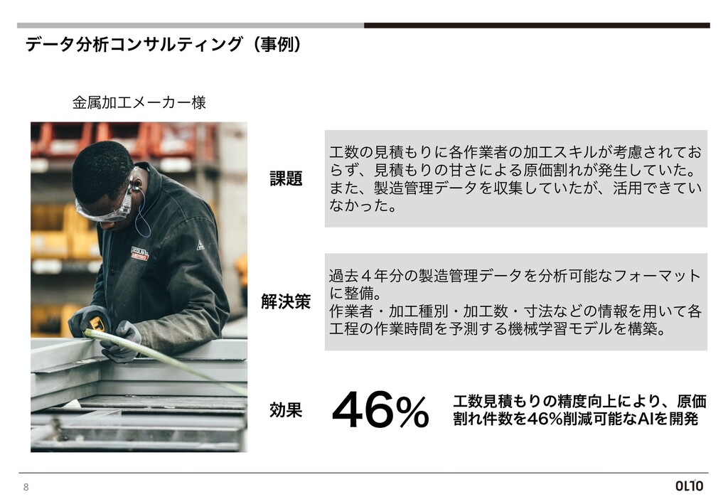 σʔλੳίϯαϧςΟϯάʢࣄྫʣ ݟੵΓͷਫ਼্ʹΑΓɺݪՁ ׂΕ݅ΛݮՄೳͳ"*Λ։ൃ ۚଐՃϝʔΧʔ༷ ͷݟੵΓʹ֤࡞ۀऀͷՃεΩϧ͕ߟྀ͞Ε͓ͯ ΒͣɺݟੵΓͷ͞ʹΑΔݪՁׂΕ͕ൃੜ͍ͯͨ͠ɻ ·ͨɺཧσʔλΛऩू͍͕ͯͨ͠ɺ׆༻Ͱ͖͍ͯ ͳ͔ͬͨɻ ՝