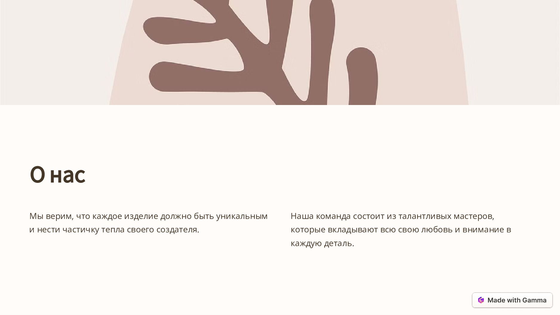 и нести частичку тепла своего создателя. Наша команда состоит из талантливых мастеров, которые вкладывают всю свою любовь и внимание в каждую деталь.